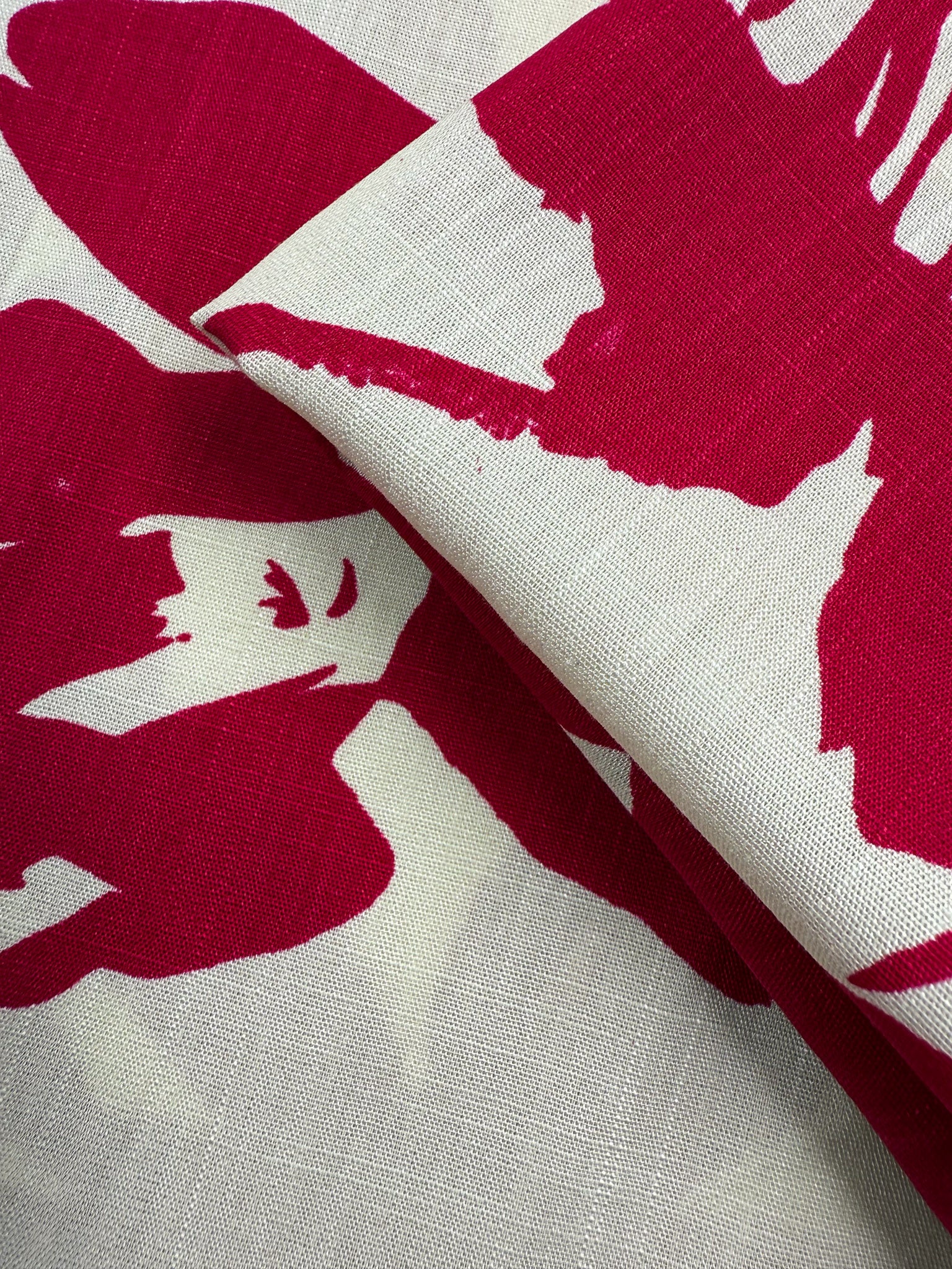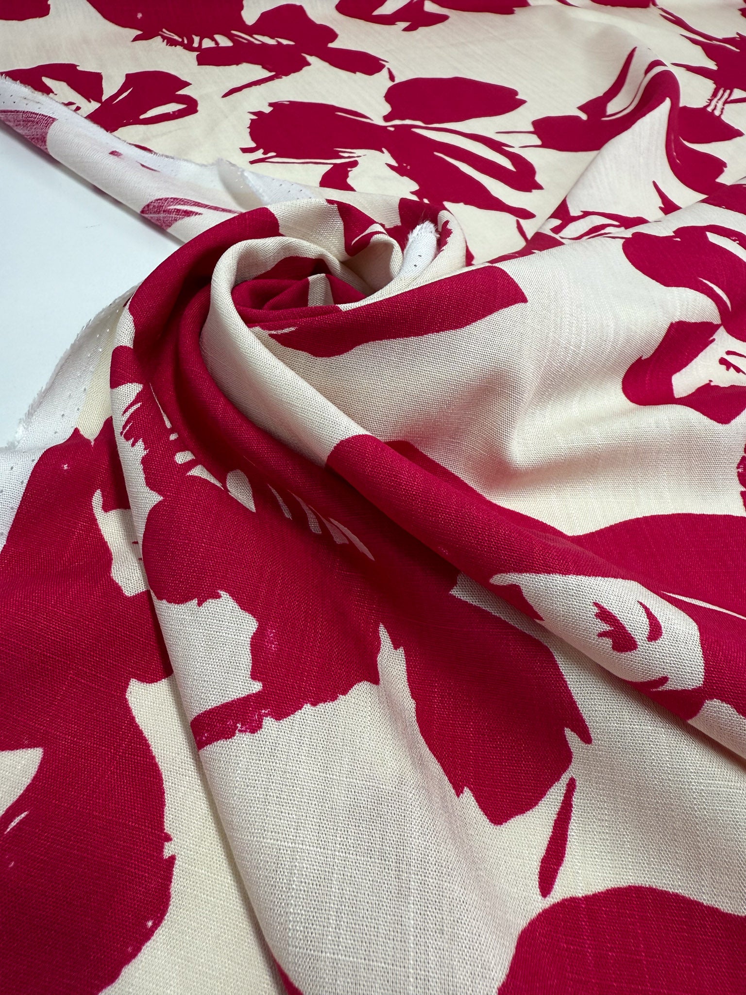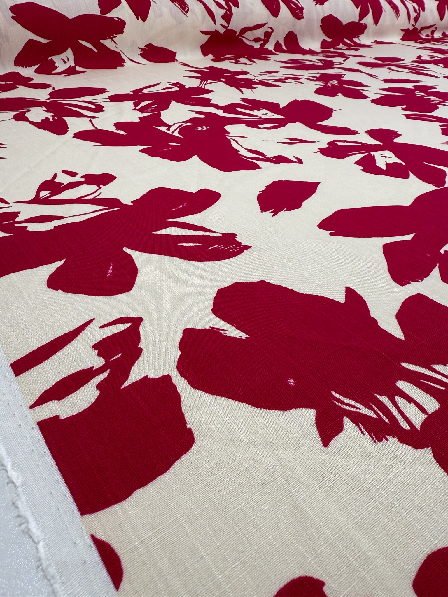 A close-up of Super Cheap Fabrics’ Bamboo Rayon - Crimson Bloom (150cm), displaying bold red abstract florals on cream. Lightweight, beginner-friendly, and partially unrolled for easy sewing.