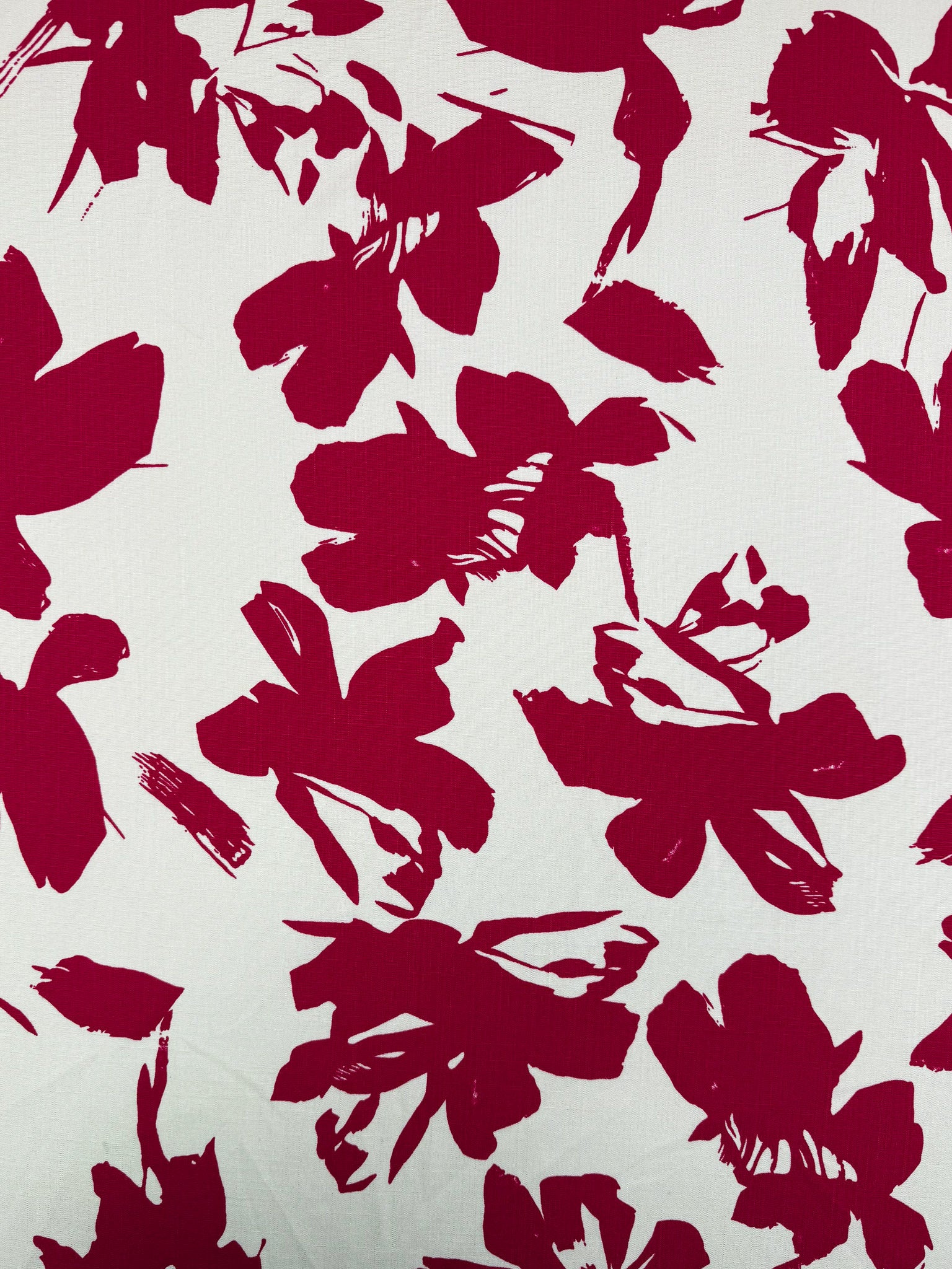 Super Cheap Fabrics’ Bamboo Rayon - Crimson Bloom - 150cm features bold red abstract floral patterns on white, ideal for lightweight projects or beginner sewing with its artistic brushstroke-inspired design.