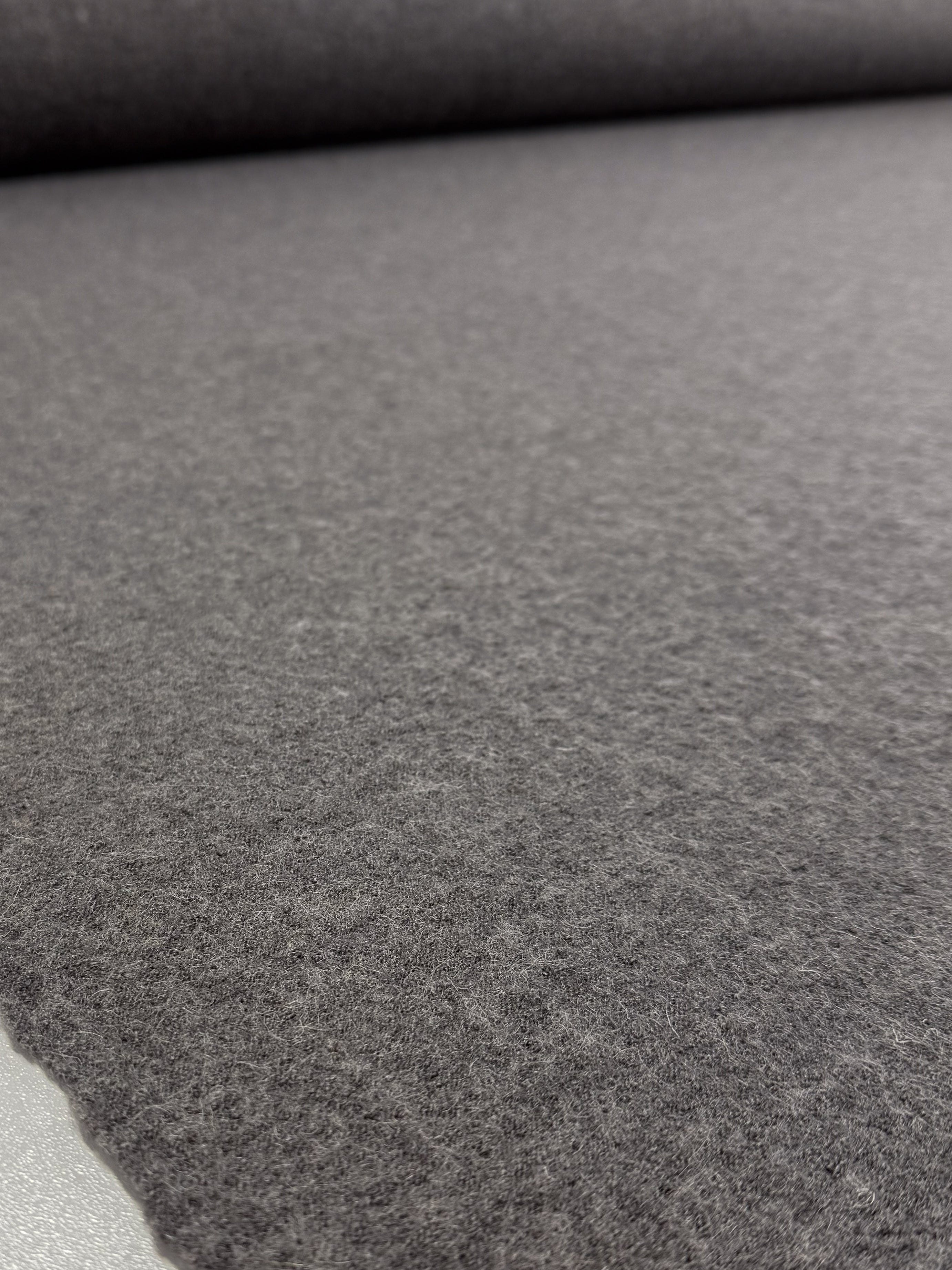 Close-up of Super Cheap Fabrics' Boiled Wool - Ghost Gray (145cm): a soft, textured felt fabric unrolled on a smooth surface, perfect for making cozy winter garments.