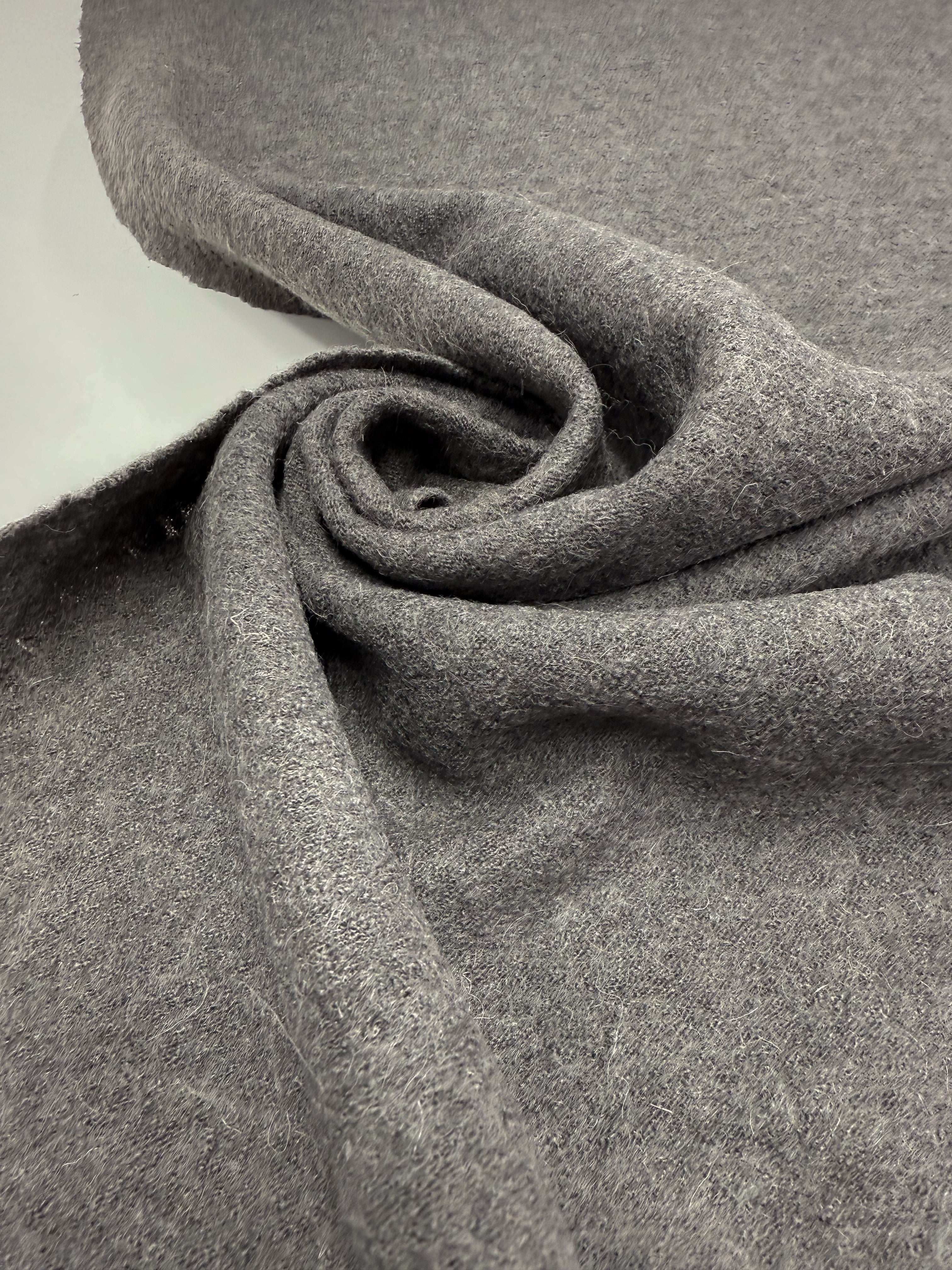 A close-up of Boiled Wool - Ghost Gray - 145cm by Super Cheap Fabrics, featuring its soft, fuzzy texture arranged in a loose spiral—ideal for cozy winter garments.