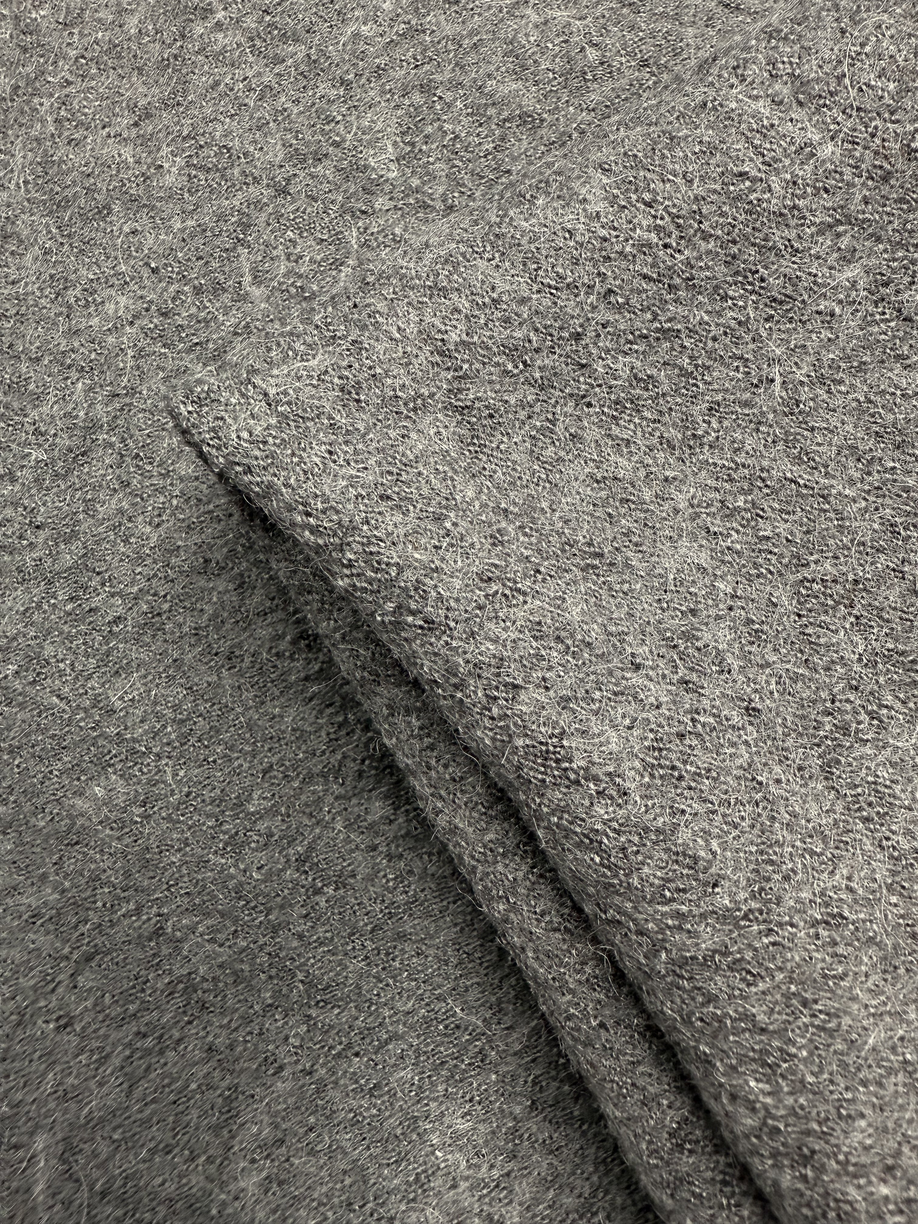 Close-up of Boiled Wool - Ghost Gray (145cm) from Super Cheap Fabrics shows its soft, fuzzy texture and visible fibers. The folded wool-viscose blend creates cozy layers, making it perfect for winter garments.