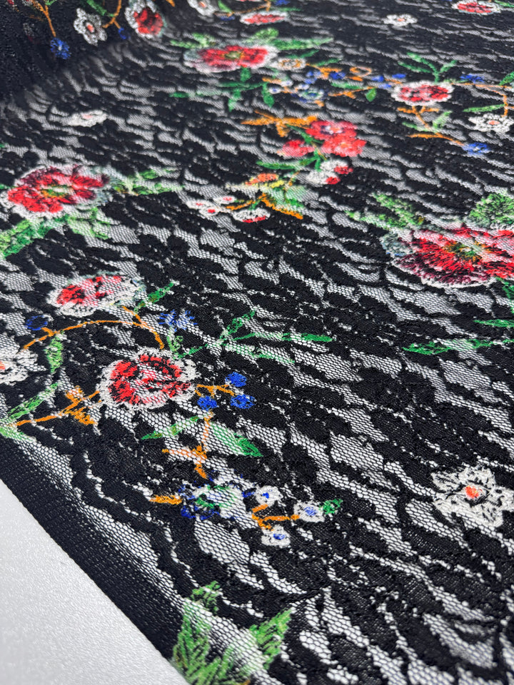 A delicate lace with gorgeous, Black background with rich red/orange embroidered-style florals, stretchy and boasts a beautiful drape. Perfect for beach cover and any style tops or dresses.