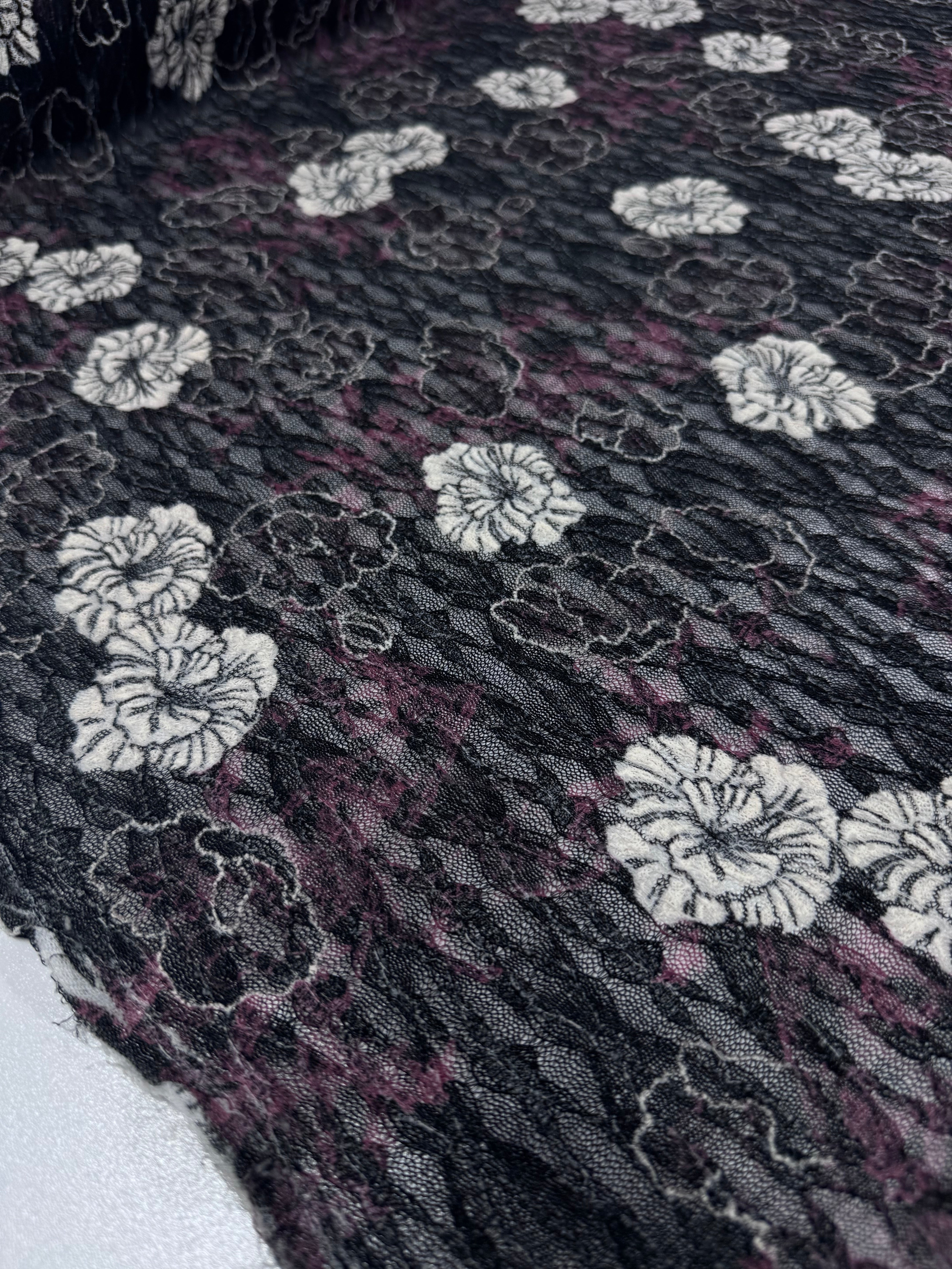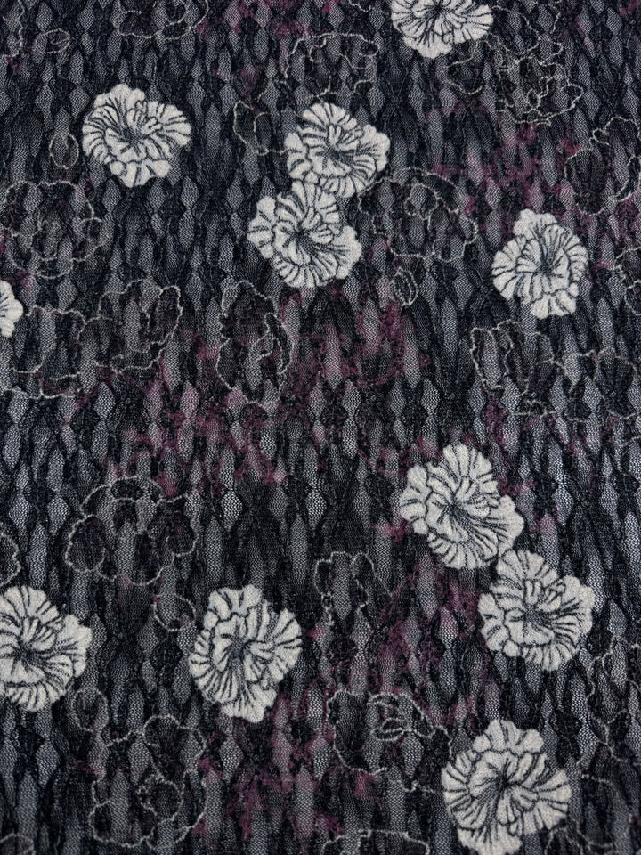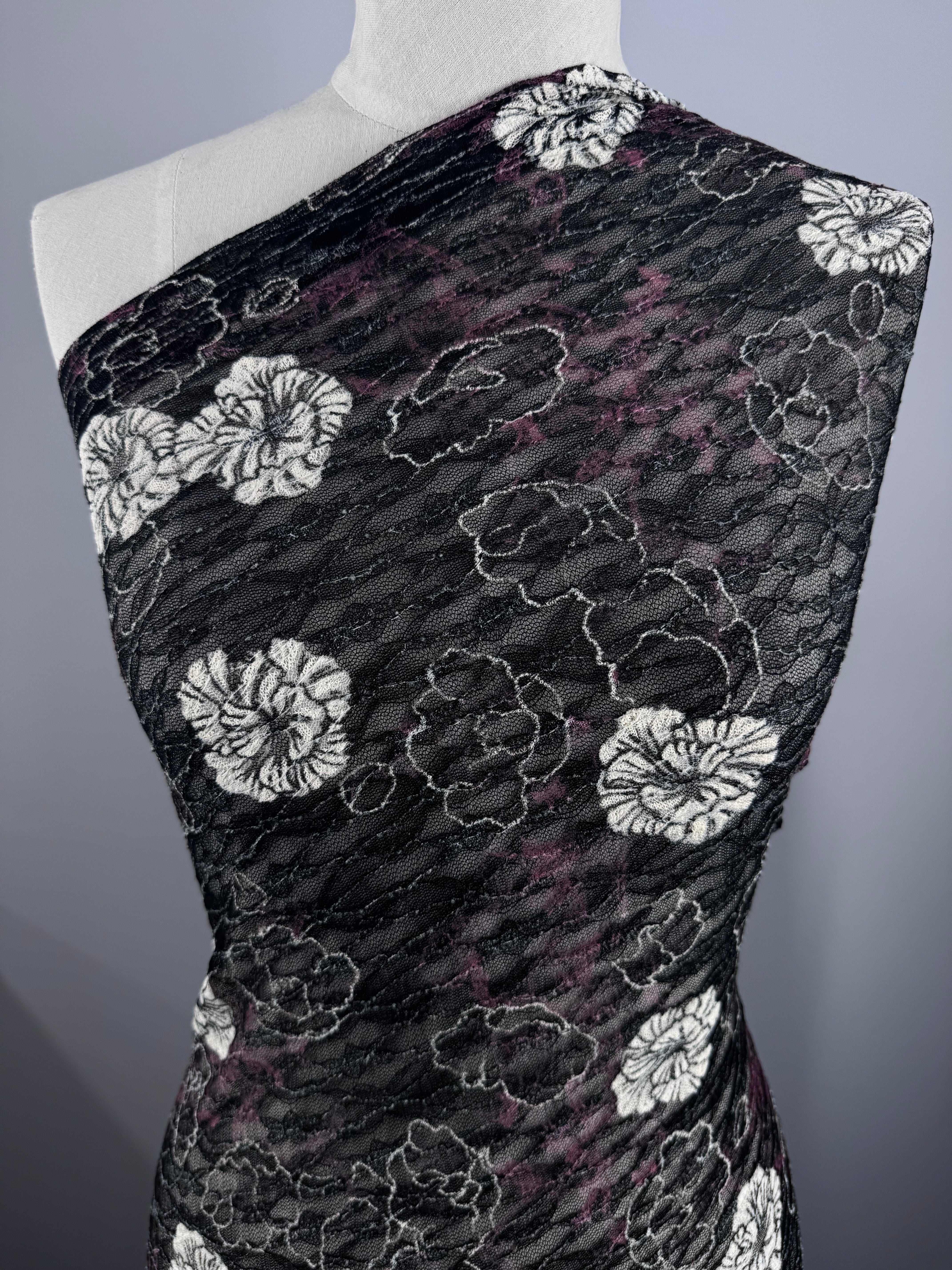 A delicate lace with a gorgeous, dark base with white florals, this stretchy piece boasts a beautiful drape. Perfect for beach cover and any style tops or dresses.