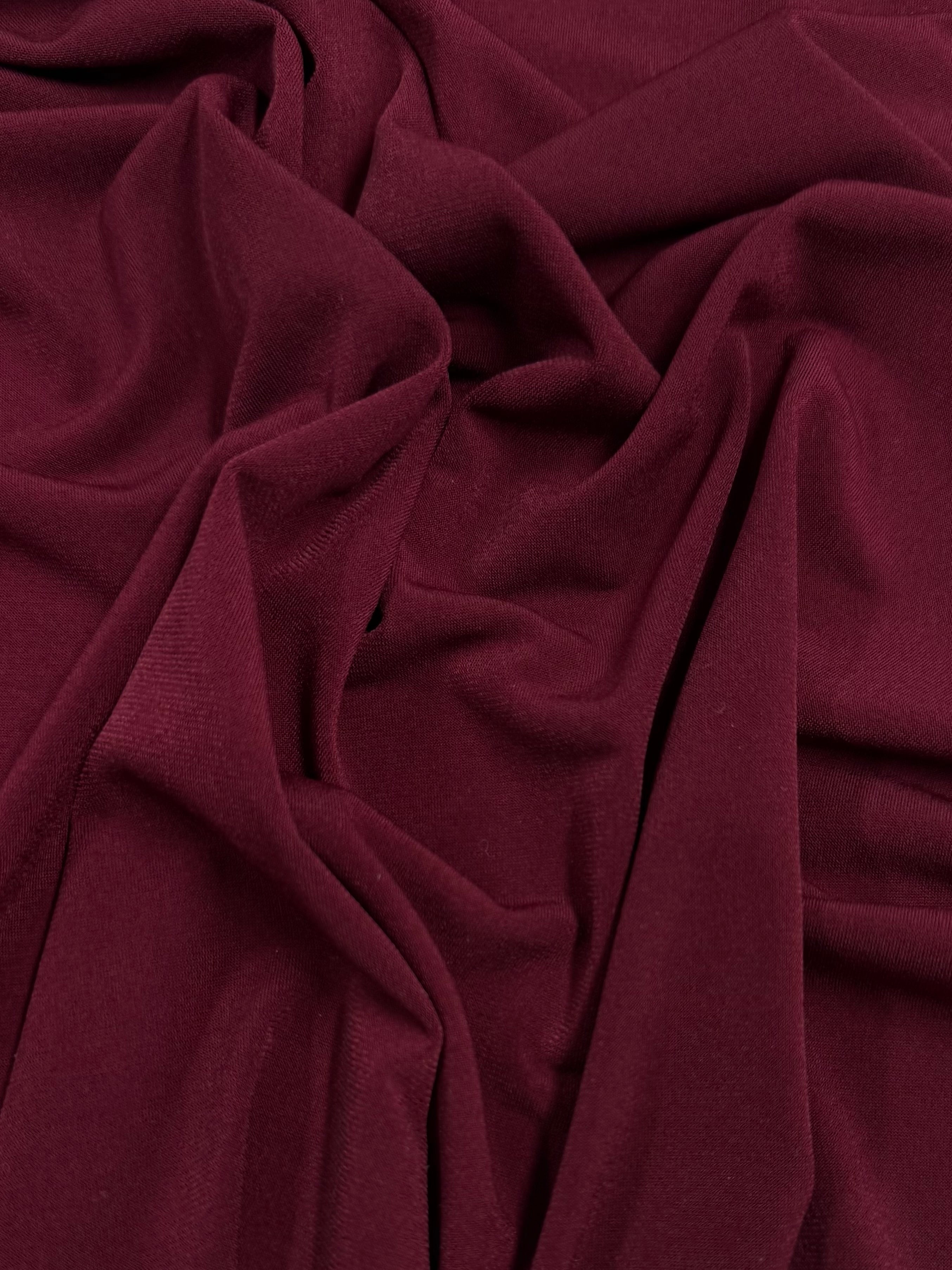 A beautiful plain, burgundy-coloured interlock twist yarn fabric. This opaque fabric has been knit to have great elasticity and a soft touch. This medium weight fabric is the perfect weight for tops, dresses skirts and loose pants.