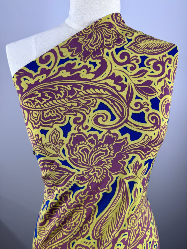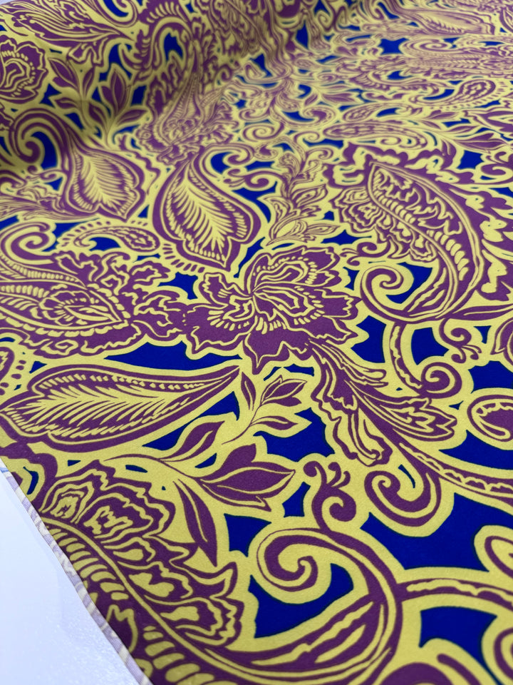 Our Printed Lycra is a Polyester/Spandex fabric that has a two-way stretch and comes in a variety of beautiful prints! Printed Lycra is a medium-weight fabric, has good durability and stretch, and washes well. Our Lycras are perfect for making tops, dresses, skirts, pants, accessories, and even childrenswear.