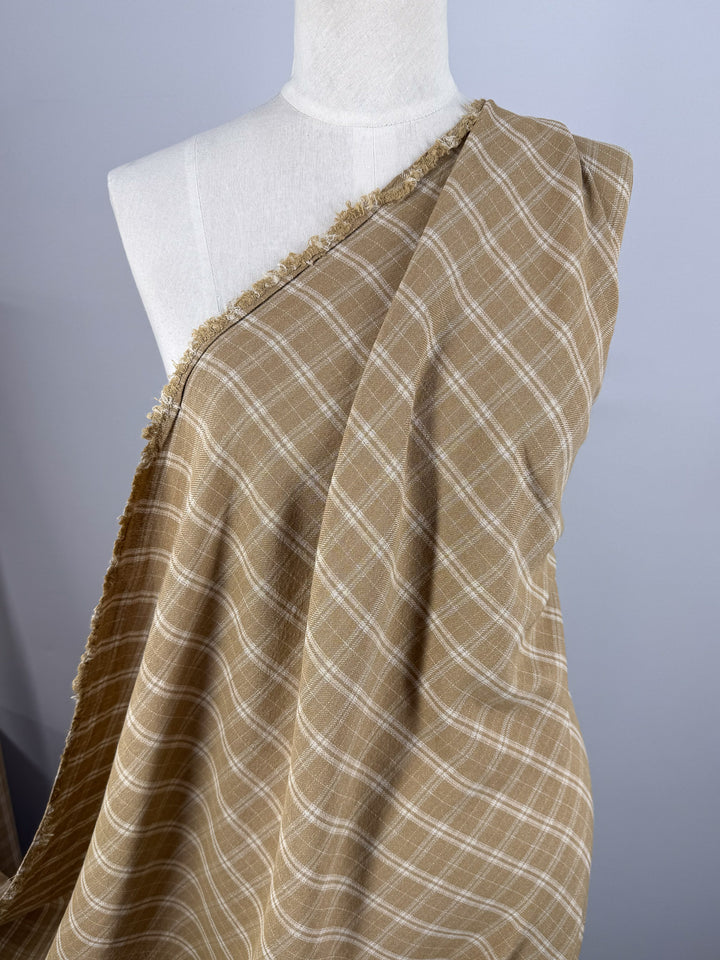 A light to medium weight soft checked twill tweed pure linen with muted tan and white.