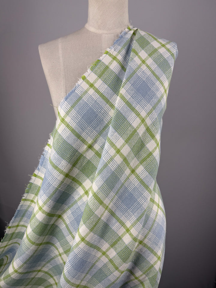 A textured weave pure linen in crisp green and blue. A fresh lime & blue linen check.