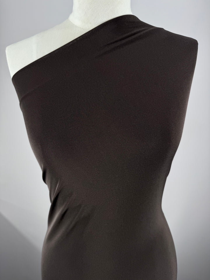 A mannequin is draped in a dark chocolate color, one-shoulder polyester fabric called Slinky Knit - Chocolate - 135cm by Super Cheap Fabrics that wraps around the torso. The smooth medium weight fabric appears to have a slight sheen, creating a subtle textured pattern under the light. The background is plain and grayish, focusing attention on the fabric and mannequin.