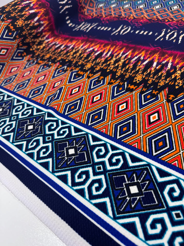 Colour: Bright multicoloured geometric tribal pattern