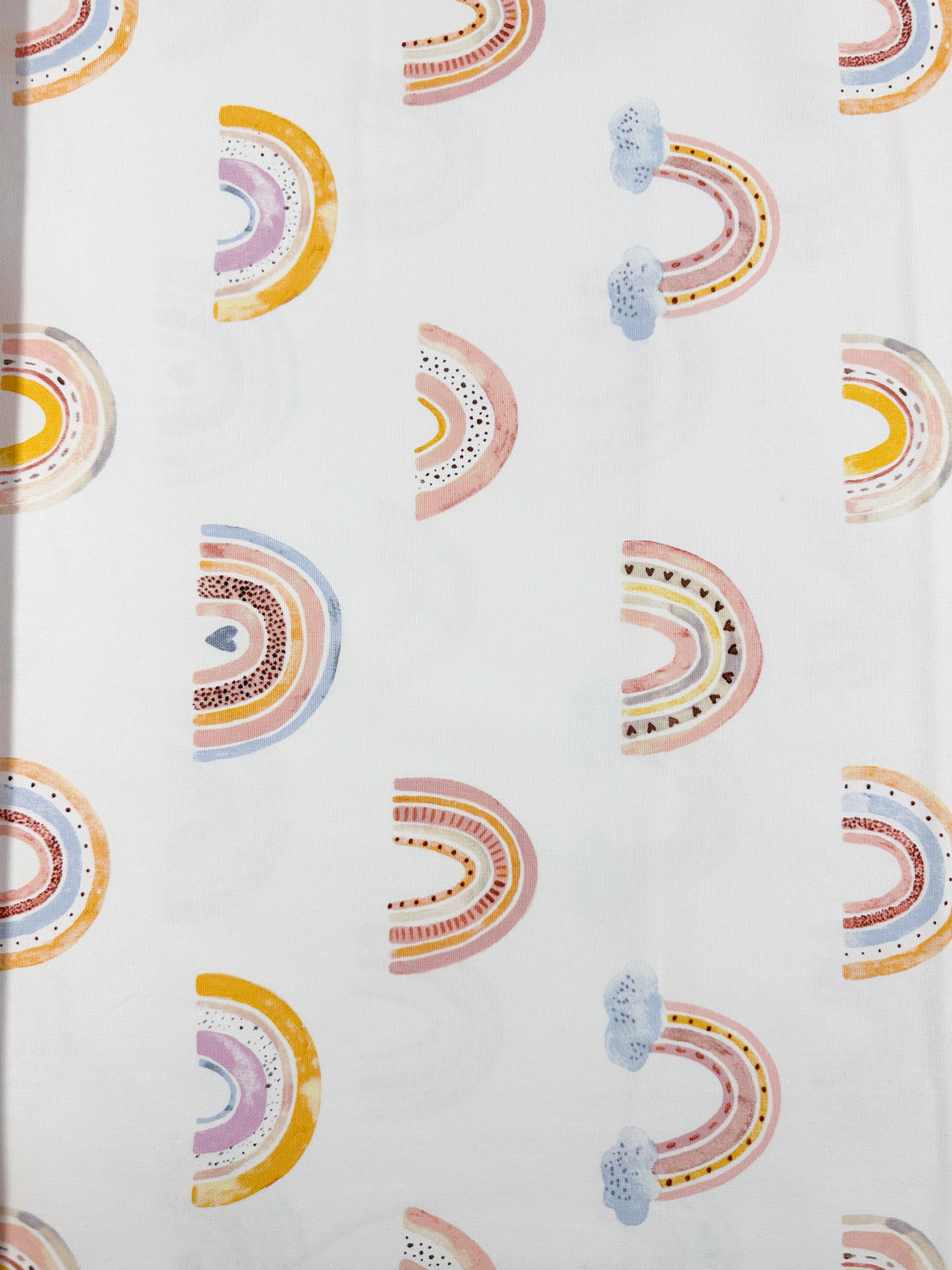Introducing the Super Cheap Fabrics' Cotton Duck - Rainbow - 112cm. This cotton fabric features an array of vibrant rainbows in soft pastel shades of yellow, pink, blue, and purple set against a light background. Ideal for tote bags or home décor projects, each rainbow showcases distinct textures and designs.