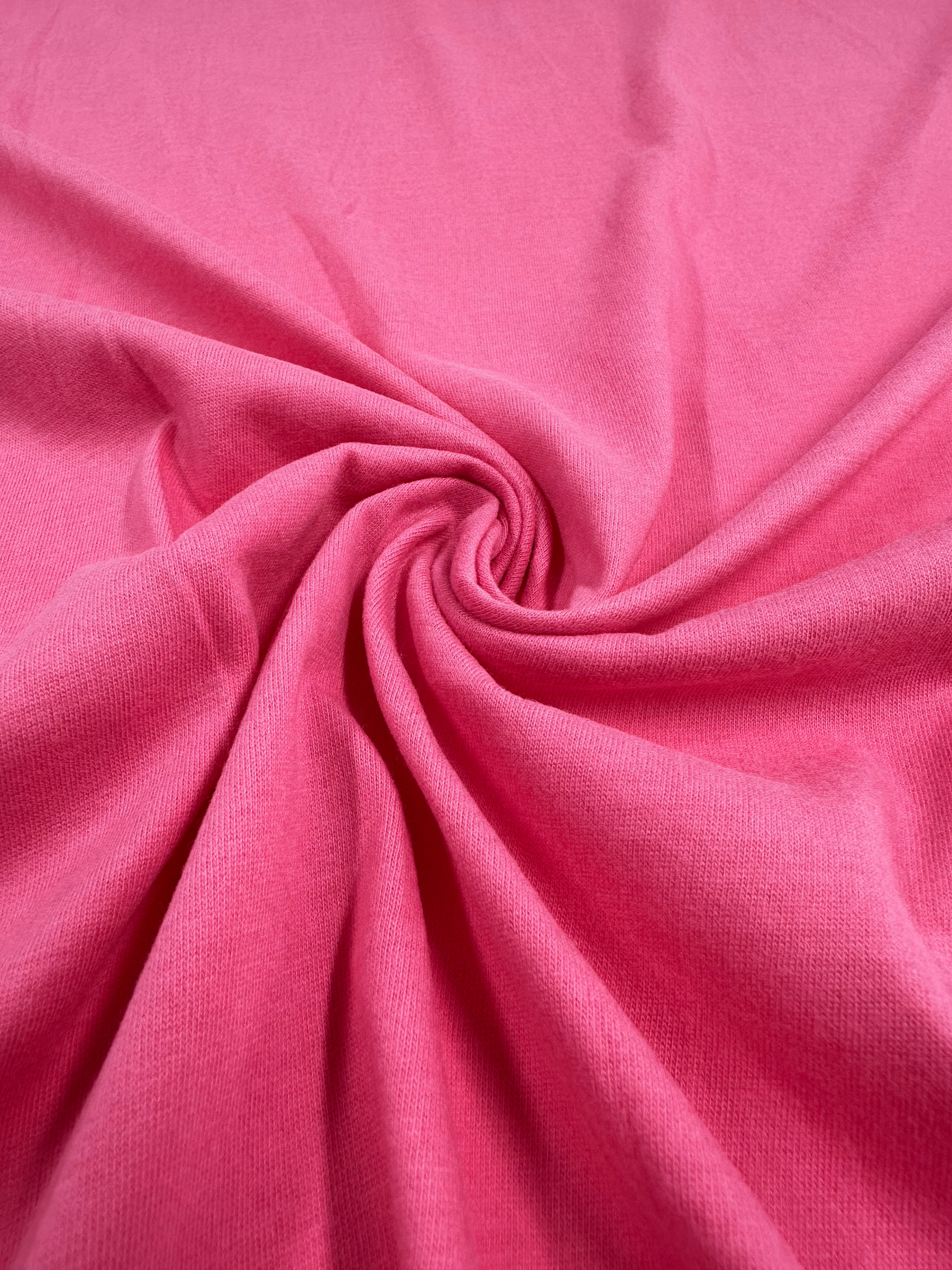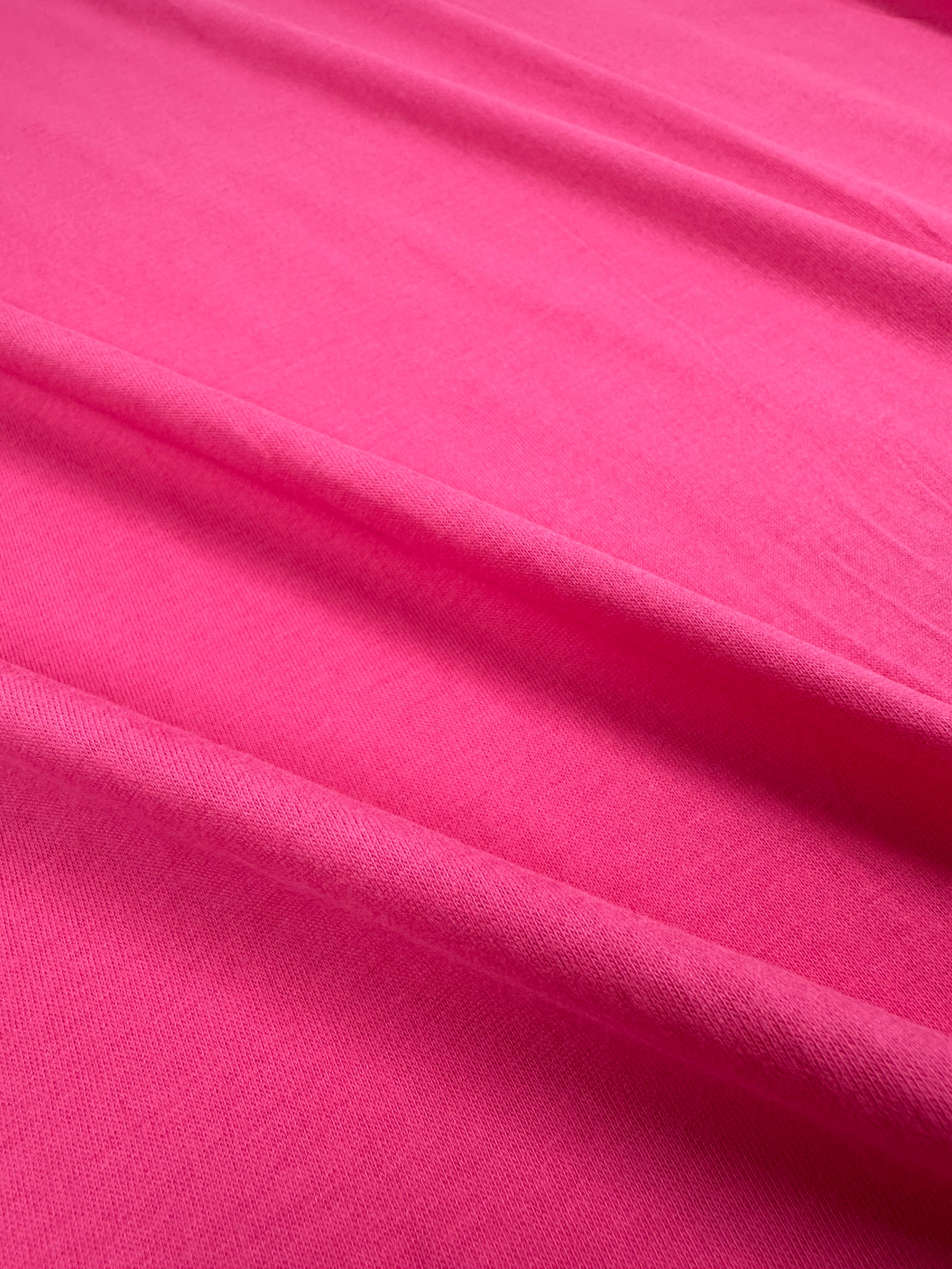 A close-up of Super Cheap Fabrics' Cotton Jersey - Fandango Pink, 160cm wide, reveals its vibrant color and smooth texture. The image features a fold that highlights the material's softness and weave.