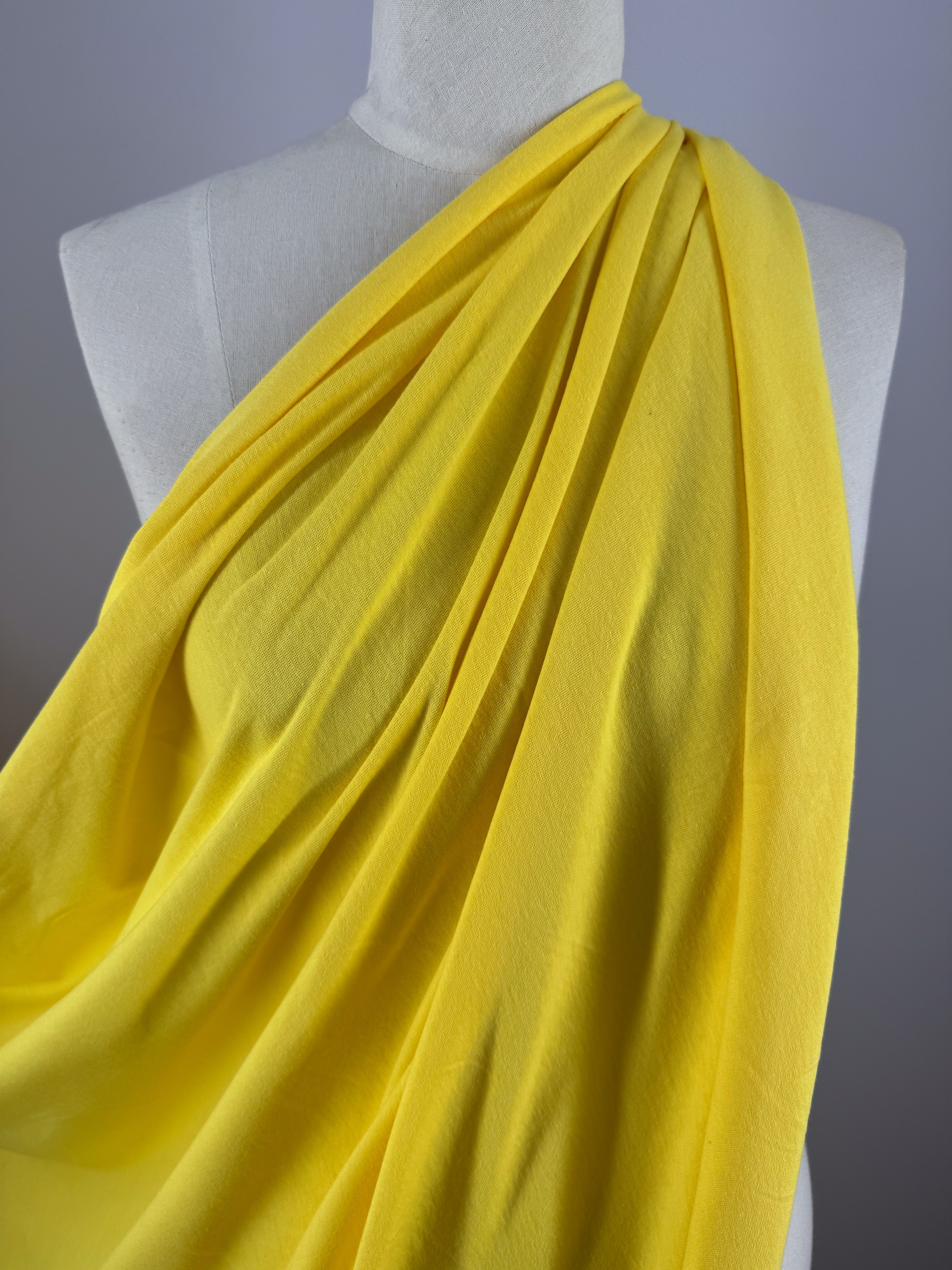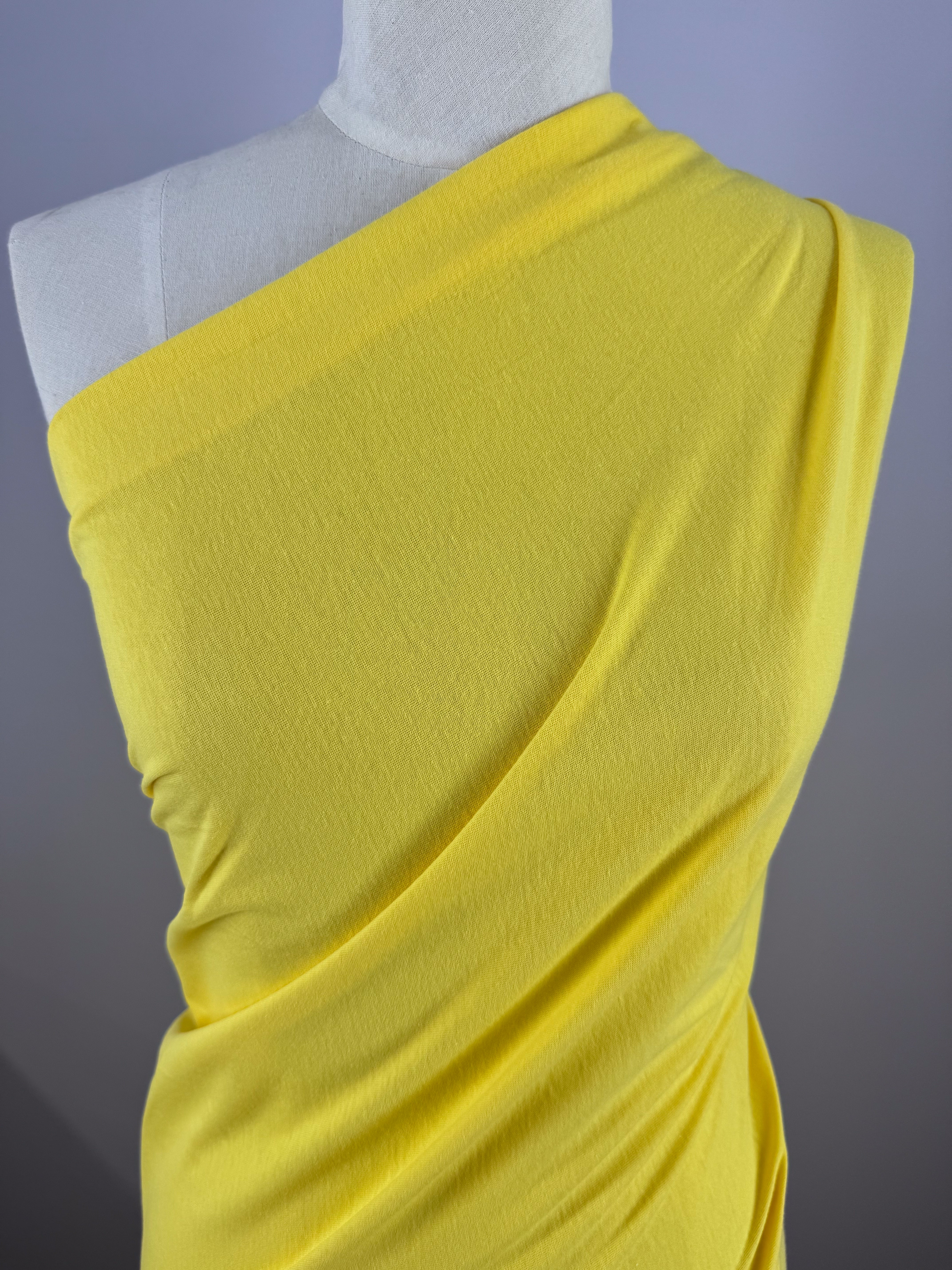 A Super Cheap Fabrics mannequin is draped with Cotton Jersey - Golden Kiwi - 155cm, flowing smoothly over the shoulder and creating soft folds. The neutral gray backdrop highlights the vibrant color and texture of this fabric.