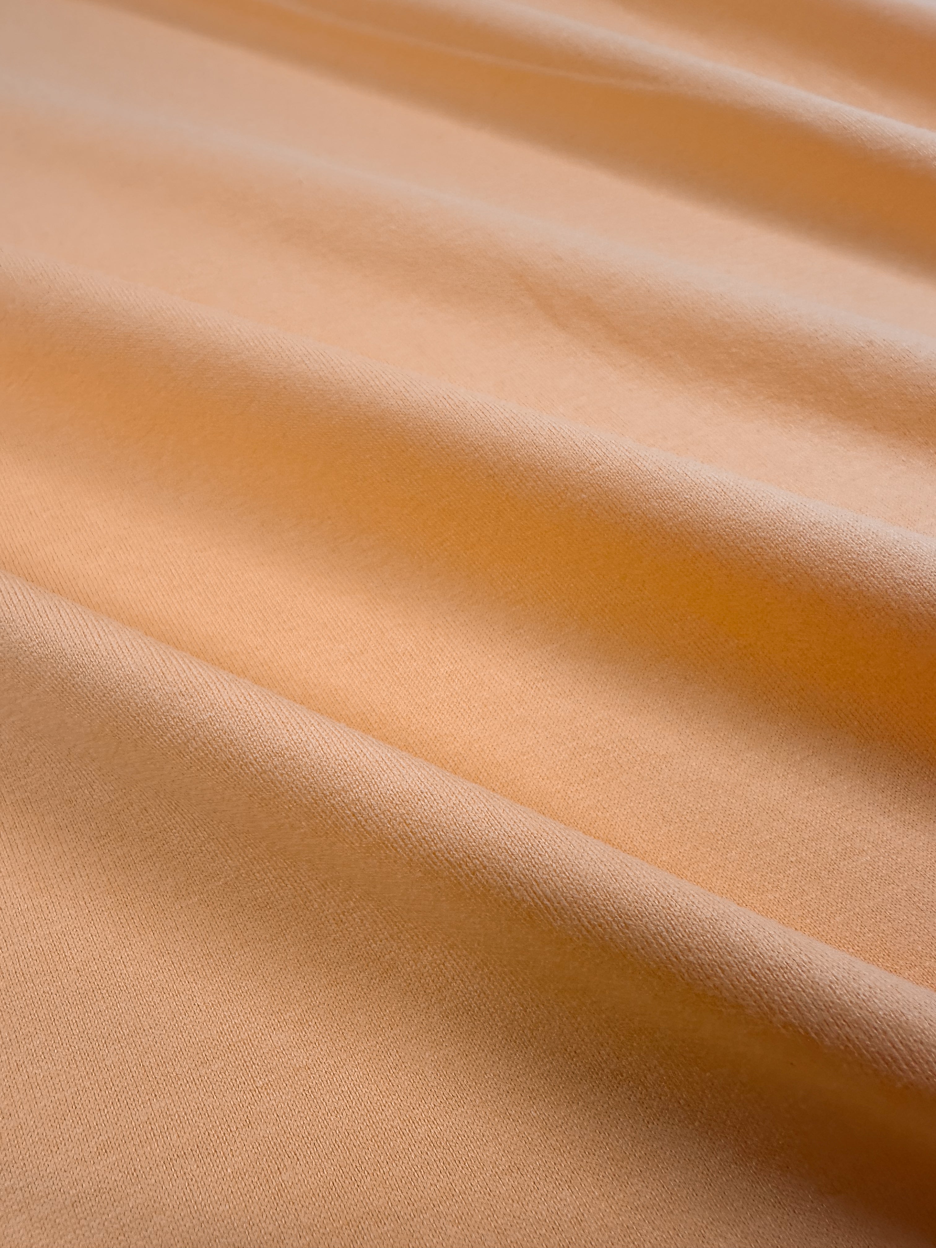 A close-up of the Super Cheap Fabrics' Cotton Jersey - Papaya, 160cm wide, shows the smooth medium weight cotton fabric in light papaya hue with slight wrinkles and folds on a flat surface.
