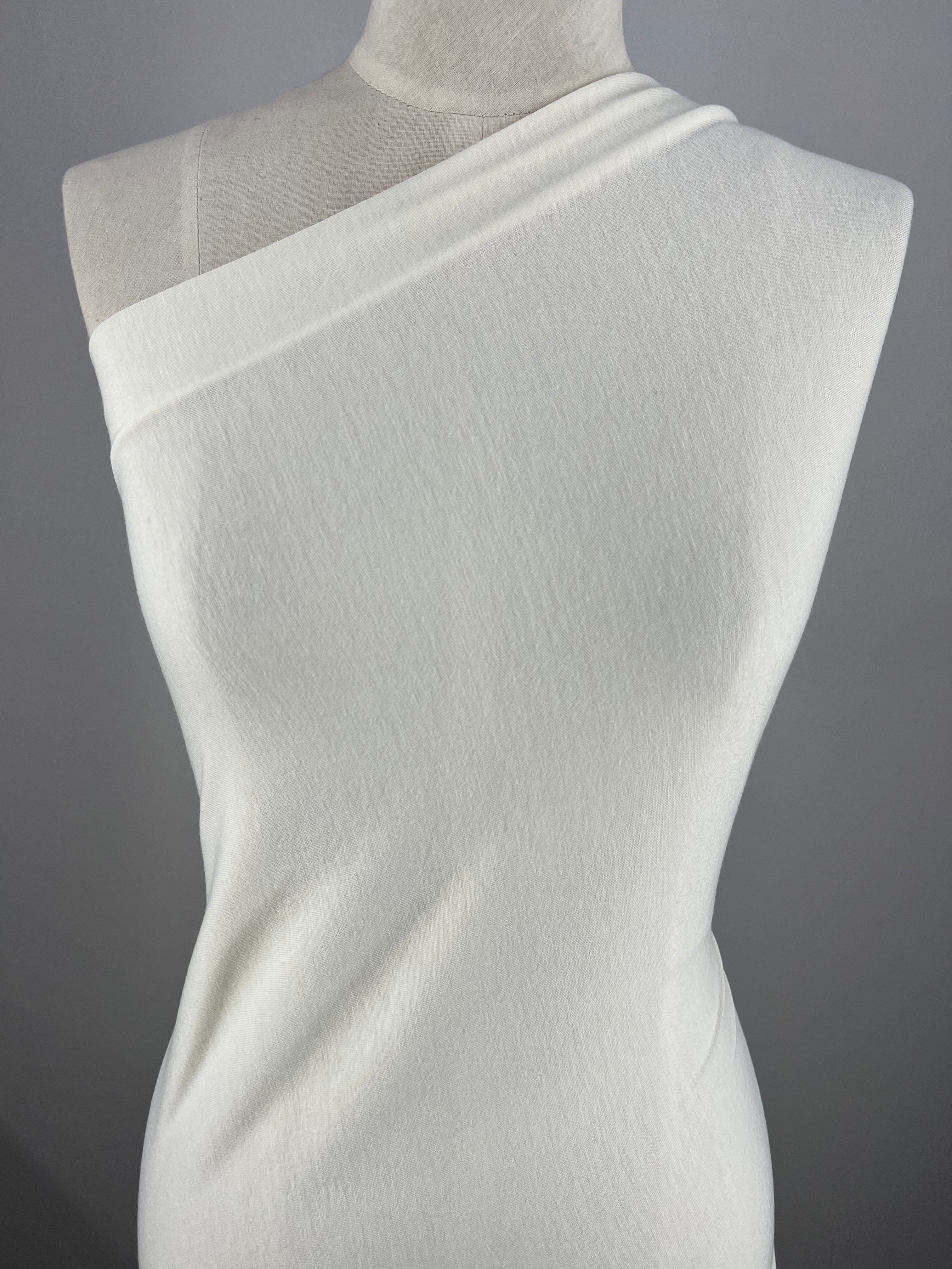 This Cotton Lycra in ivory is suited to all year round garments! It is medium weight, two way stretch fabric is the perfect weight for tops, dresses, skirts and loose pants.