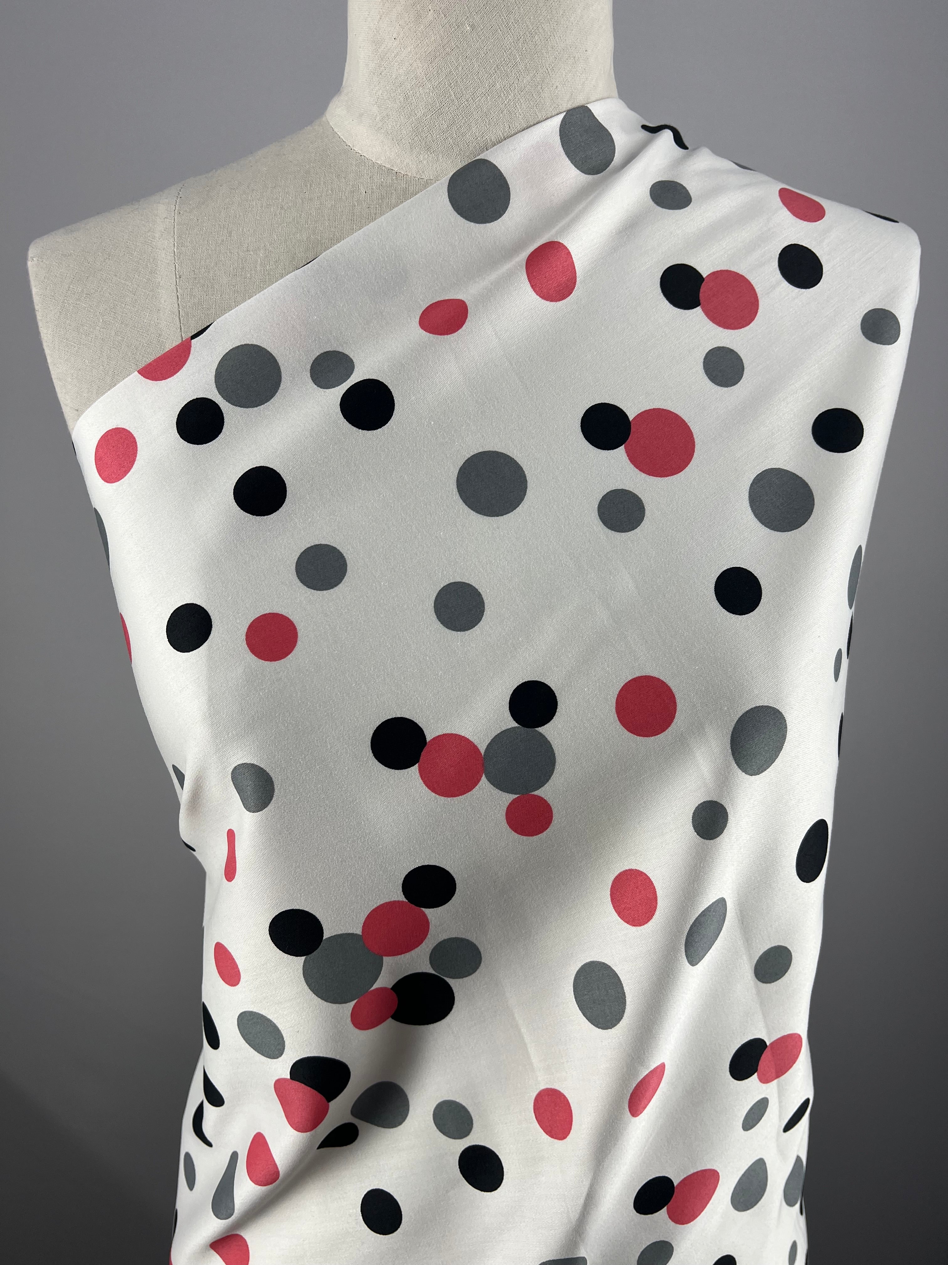 Close-up of Super Cheap Fabrics’ Cotton Sateen - Bordered Bubbles - 145cm, showcasing a 100% cotton fabric with a polka dot pattern featuring black, red, and gray circles of varying sizes on a white background. The lightweight fabric is neatly folded in one corner, making it perfect for household décor items.