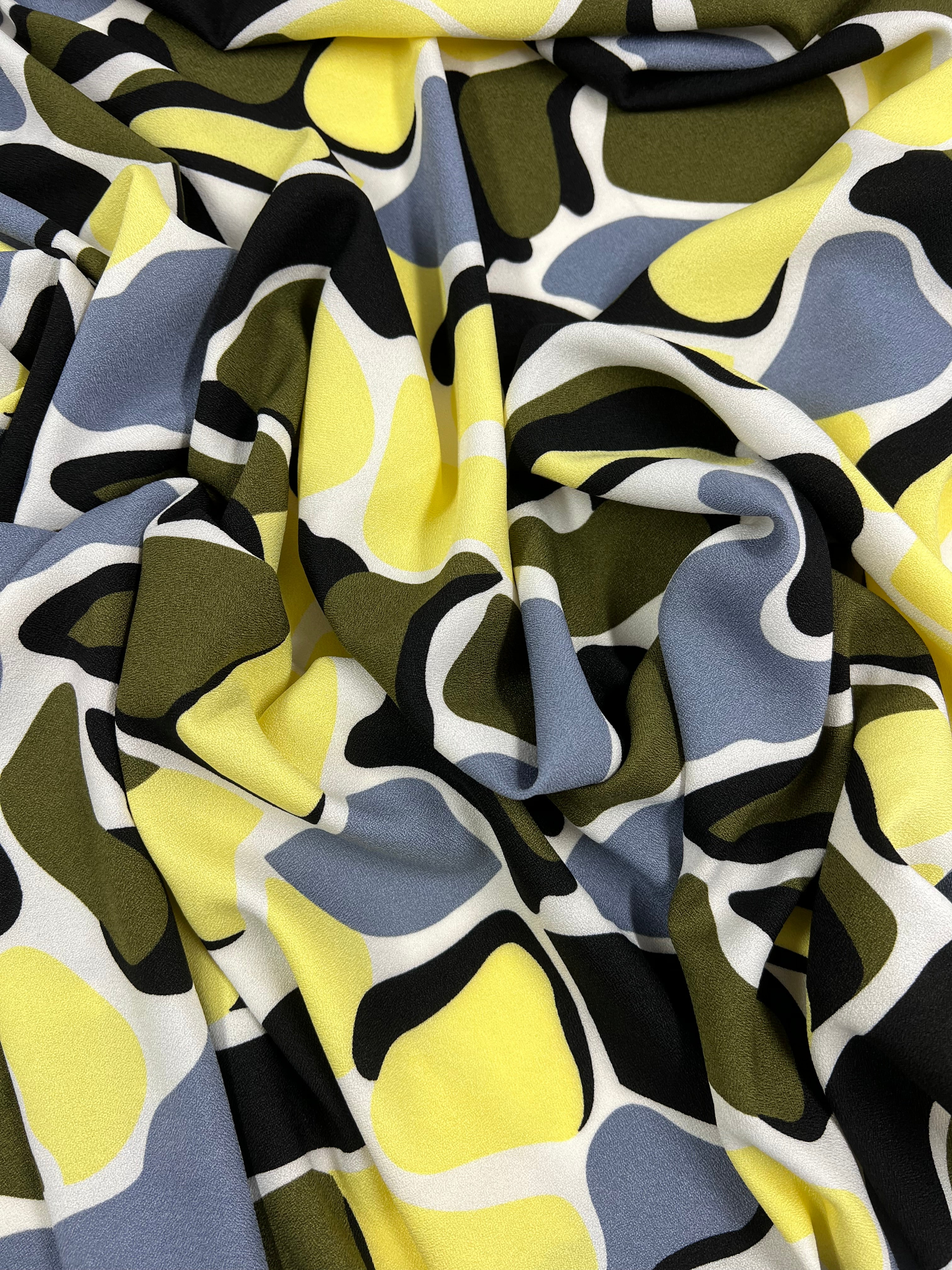 The "Printed Crepe - Camo Special - 150cm" by Super Cheap Fabrics showcases a vibrant, lightweight polyester fabric with an abstract pattern of interlocking shapes in yellow, black, white, olive green, and gray. It appears soft and draped with folds and shadows, ideal for versatile uses.