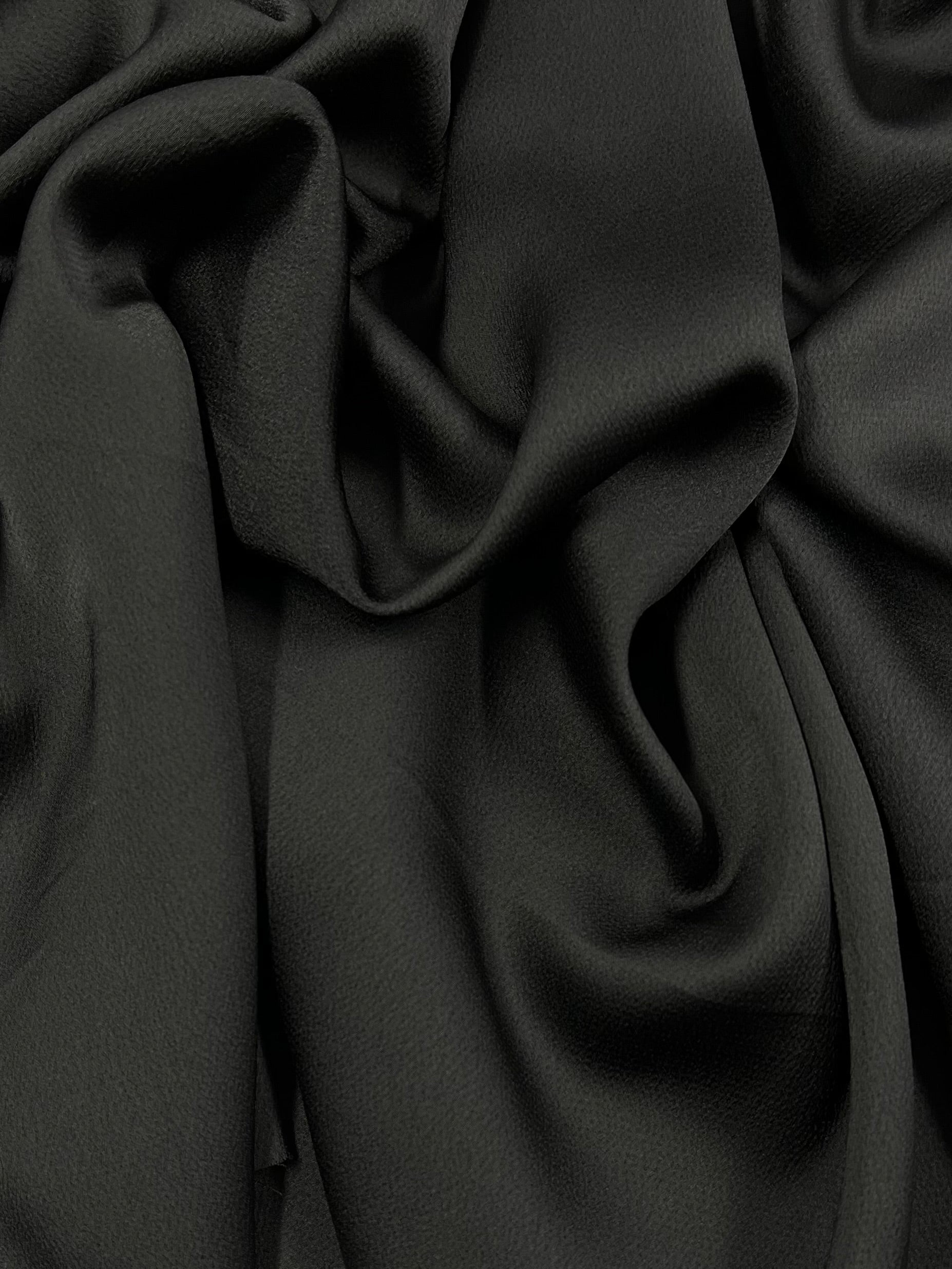 A close-up image of black, medium weight fabric with soft folds and drapes. The Crepe De Chine - Black - 150cm by Super Cheap Fabrics appears to have a slight sheen and a rich, luxurious texture.