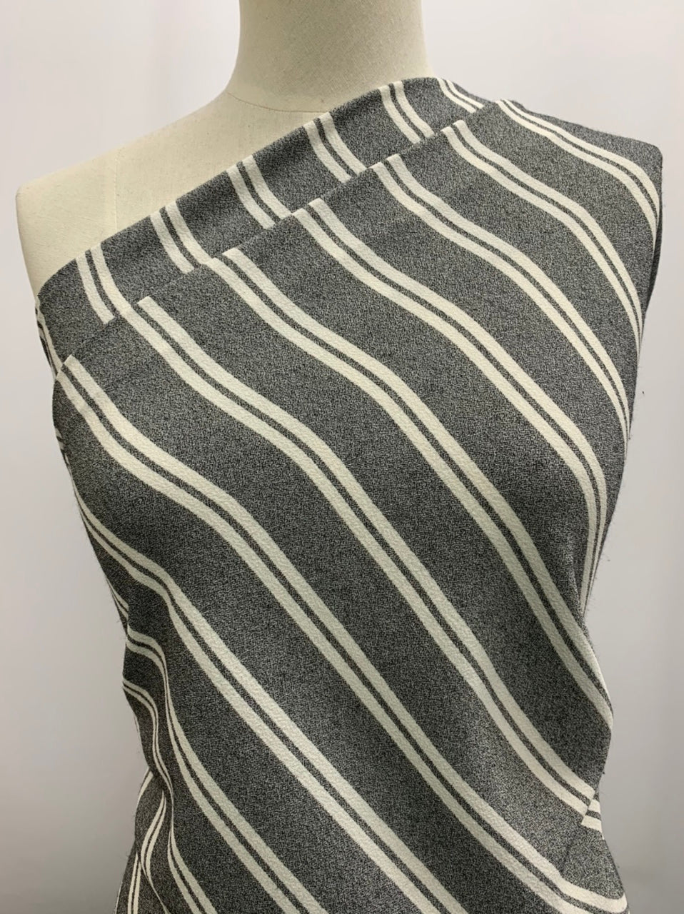 A close-up view of a medium-weight fabric featuring diagonal white stripes on a gray background. The texture of the Crepe - Zoe Stripe - White by Super Cheap Fabrics, made from a polyester viscose elastane blend, is visibly detailed, highlighting the pattern and weave. One corner of the fabric is folded over.