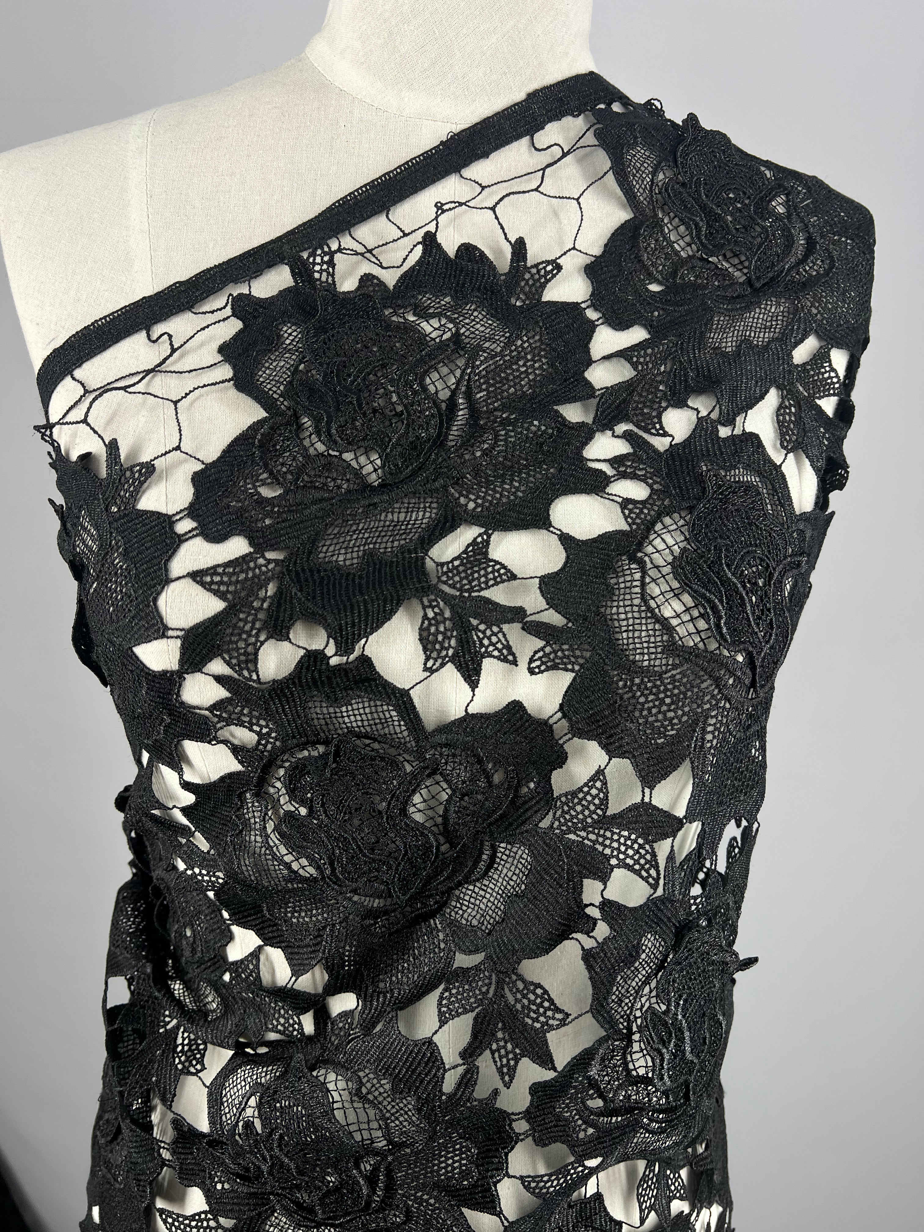 A close-up image of a mannequin draped in Designer Anglaise Lace - Black - 120cm by Super Cheap Fabrics featuring intricate floral patterns. Made from 100% polyester, the fabric's detailed roses and foliage create an elegant, textured design on a white background. The black fabric has a 120cm width, perfect for various crafting needs.
