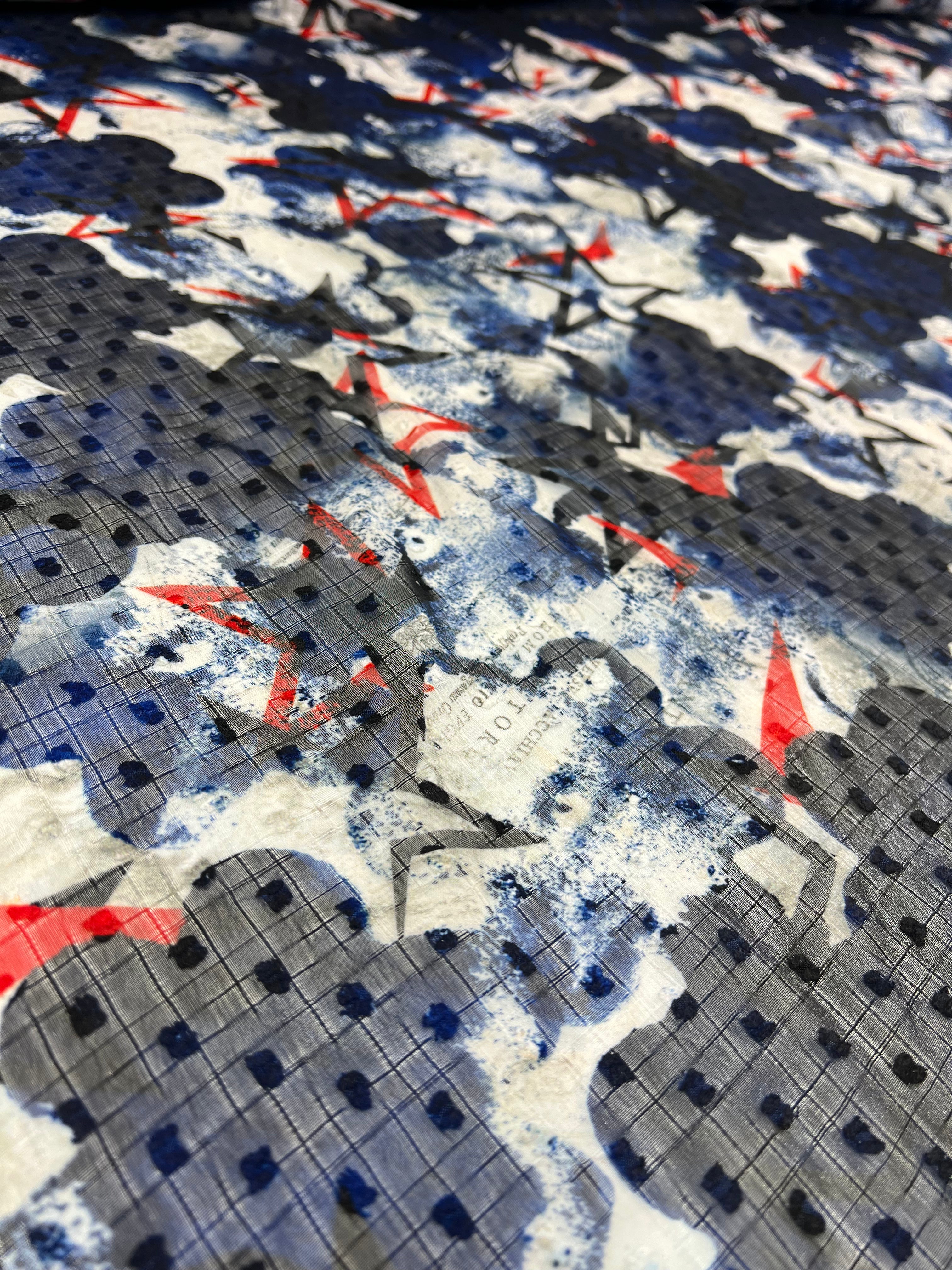 Close-up of a piece of fabric with an abstract pattern. This light weight fabric, made of 100% polyester, features a mix of navy, blue, and white colors with splashes of red. The texture appears slightly crinkled, and the pattern has a mix of geometric shapes and speckled areas, making it truly multi-faceted. Introducing Designer - Stars & Clouds - 143cm by Super Cheap Fabrics.