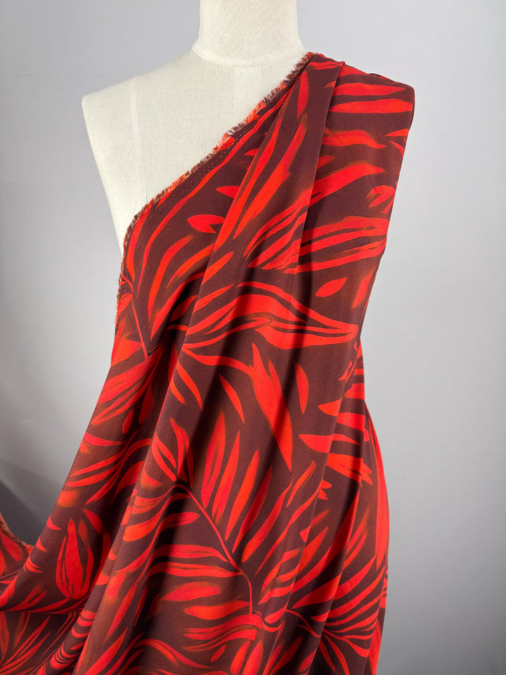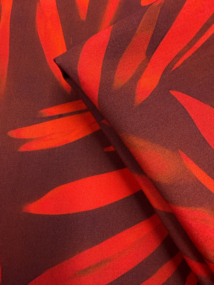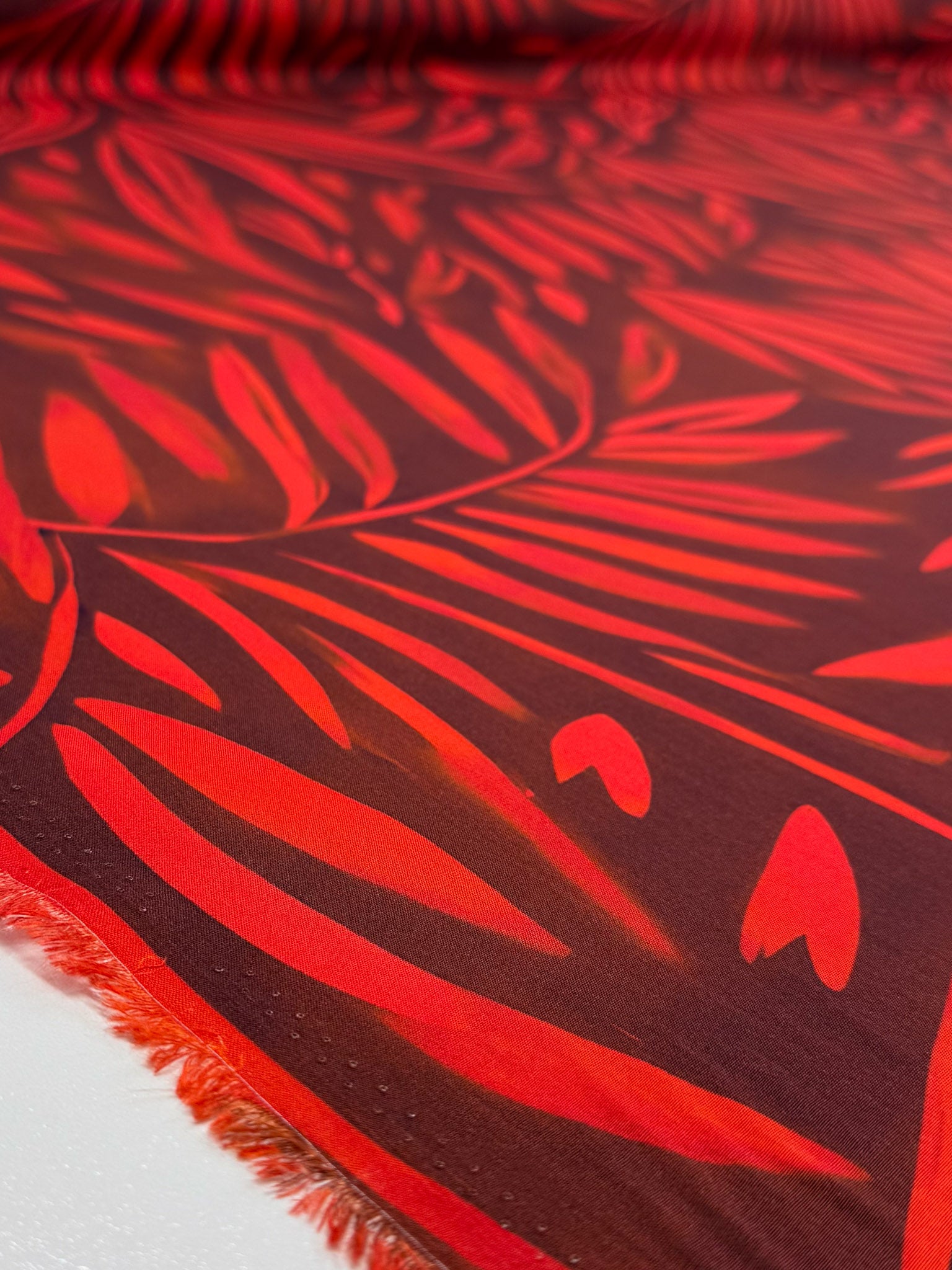 Our Designer Rayon showcases a beautiful and colourful fabric with vibrant prints that can be used for various purposes such as dresses, skirts, blouses, curtains, and more. Our collection showcases a soft, lightweight fabric with a smooth drape and a luxurious feel. Overall, rayon fabric offers both comfort and style, making it a versatile choice for any project. Crimson Palm showcases a bold tropical leaf design in radiant shades of crimson and red, contrasted beautifully against a deep brown base.
