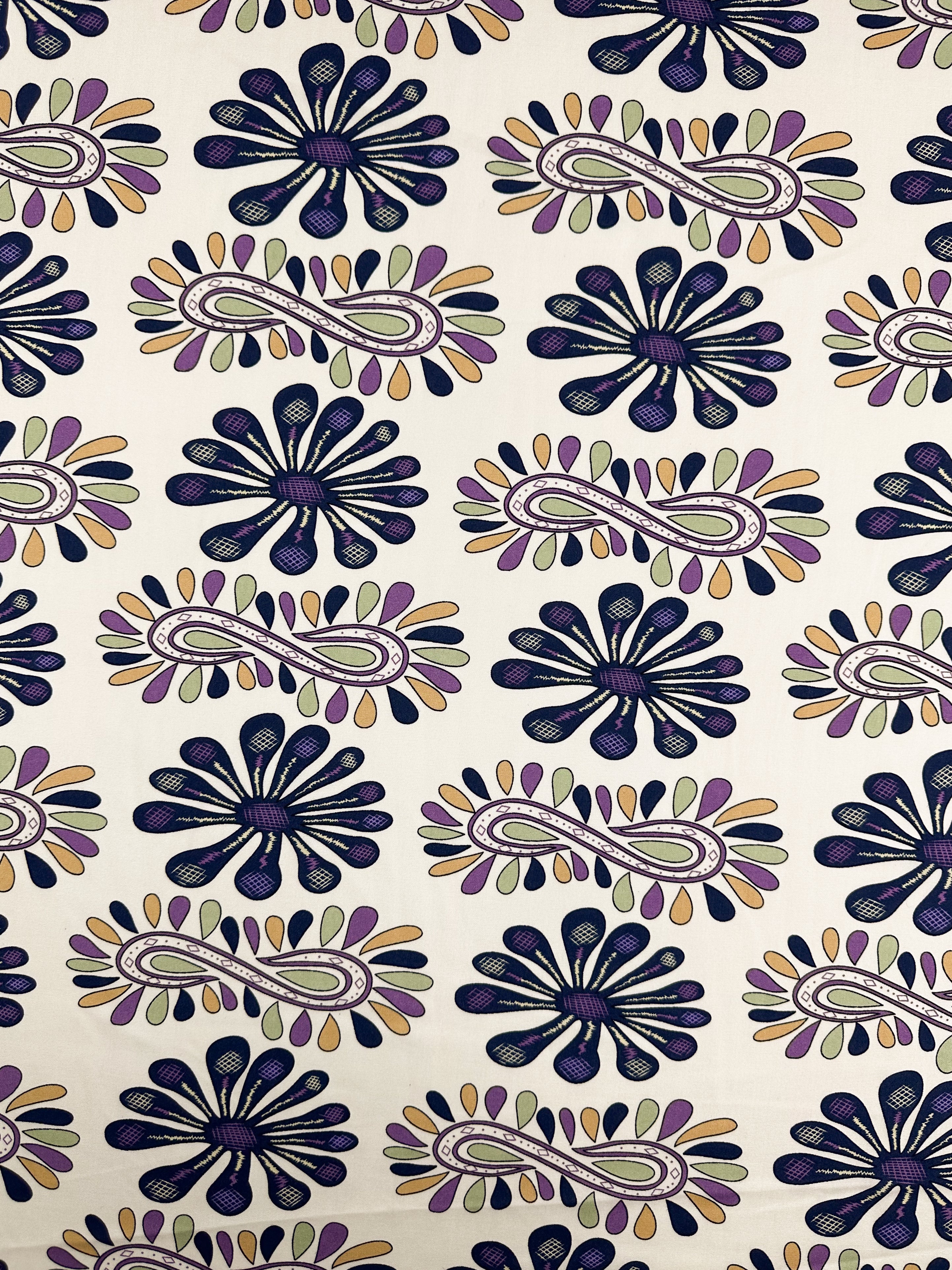 Lilac Tempo - Border print in soft lavender, mustard, and navy geometrics with a rhythmic flow.