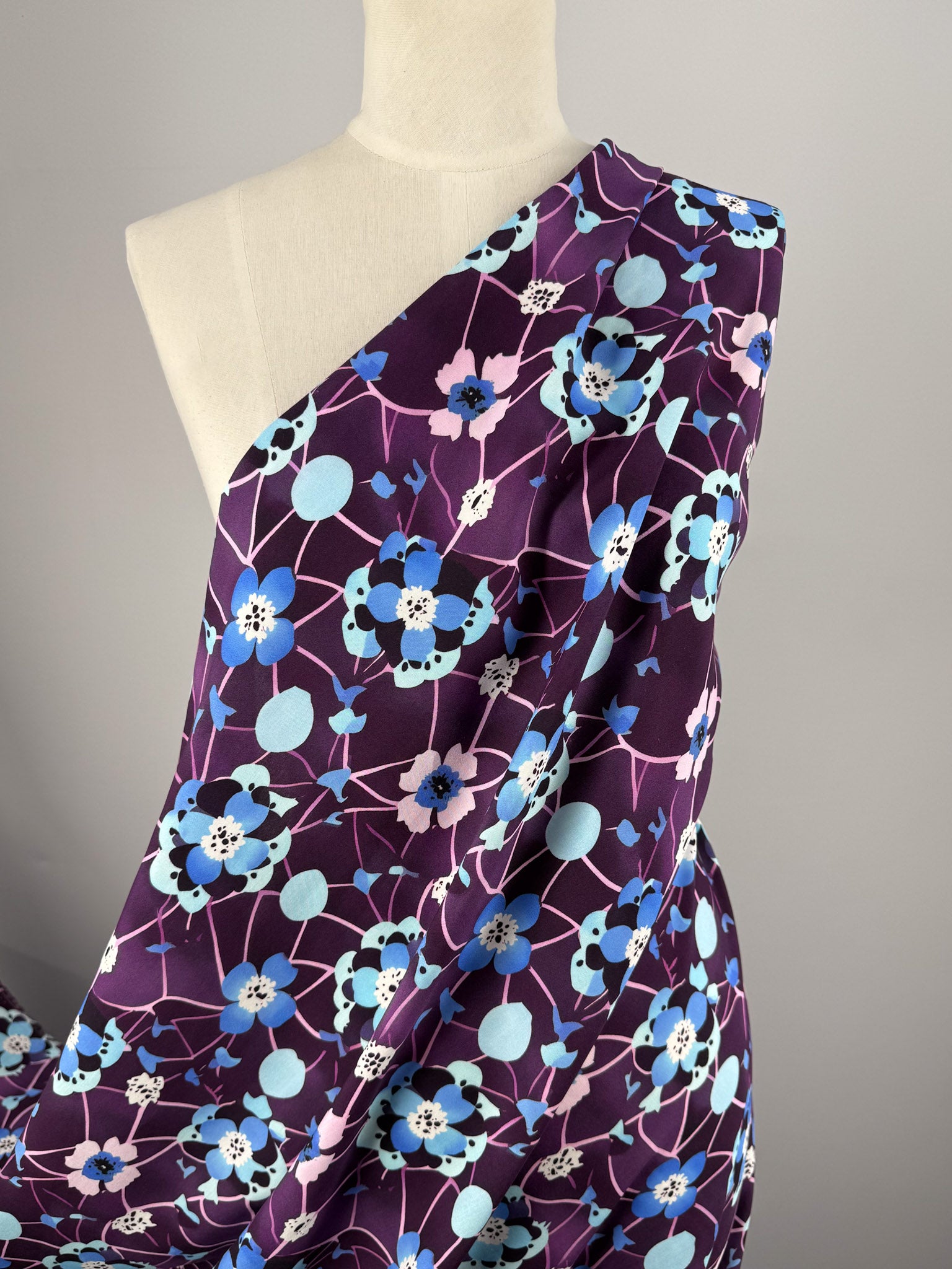 Our Designer Rayon showcases a beautiful and colourful fabric with vibrant prints that can be used for various purposes such as dresses, skirts, blouses, curtains, and more. Our collection showcases a soft, lightweight fabric with a smooth drape and a luxurious feel. Overall, rayon fabric offers both comfort and style, making it a versatile choice for any project. Luna Bloom features delicate floral clusters in tones of sky blue, lilac, and soft aqua, set against a rich plum base.