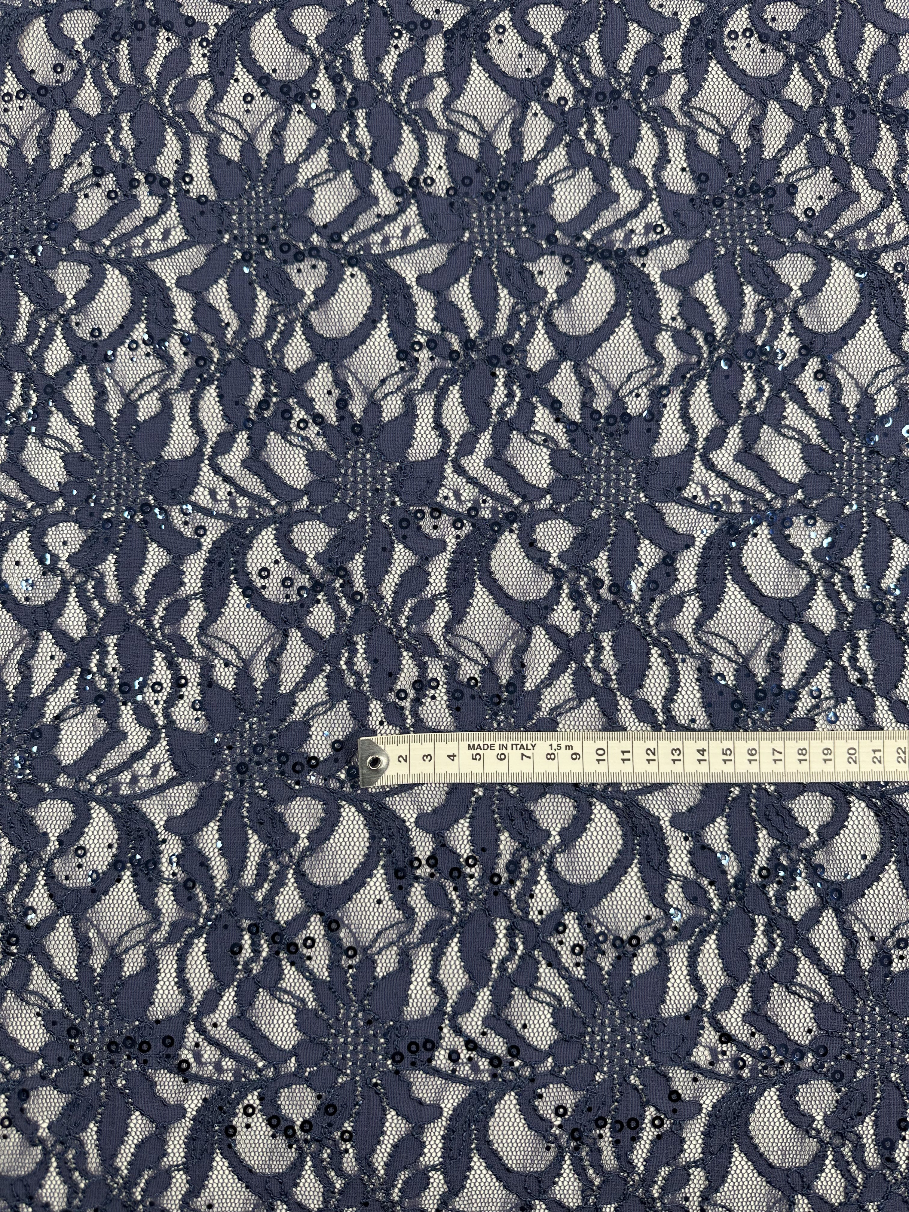 A close-up of a mannequin showcases "Evening Lace - Bengu - 135cm" by Super Cheap Fabrics, featuring a one-shoulder dress made from sheer, navy lace. The 100% polyester fabric is adorned with an elaborate floral pattern and small, subtle sequins scattered throughout, creating a textured and elegant appearance.