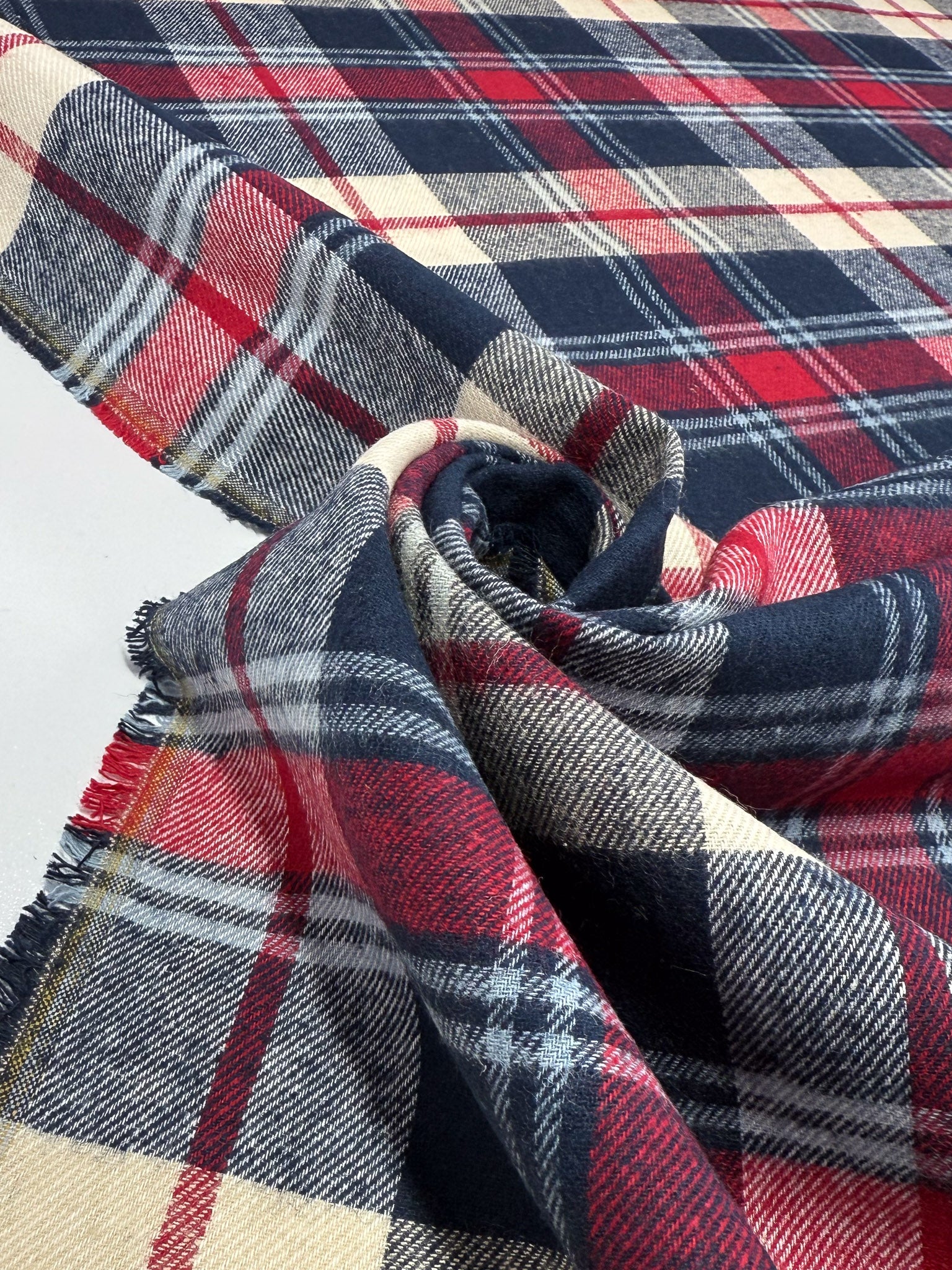 A close-up of Super Cheap Fabrics' Flannel Tartan - Highland (145cm), a medium weight cotton in red, navy, cream, and gray Scottish-style plaid, swirled to reveal its texture and frayed edge on a white surface.