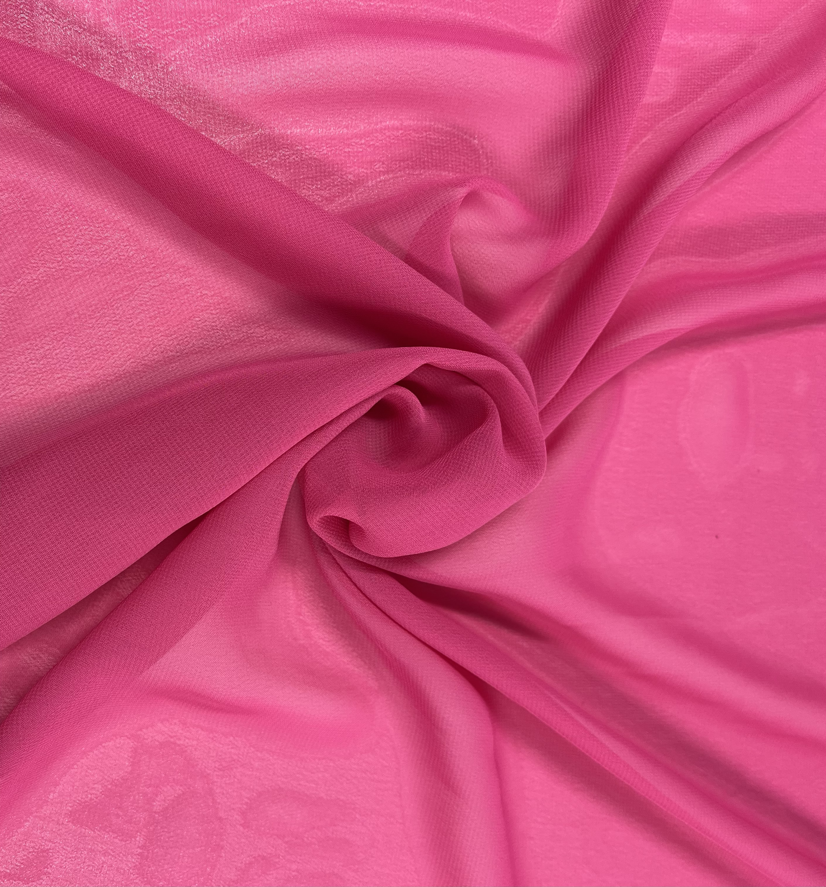 Close-up of the Hi-Multi Chiffon in hot pink, a fabric by Super Cheap Fabrics, elegantly arranged in a loose spiral. This 150cm wide polyester material forms a textured, swirling pattern. Its lightweight nature makes it appear soft and airy, with gentle folds and subtle shadows enhancing its delicate appearance.