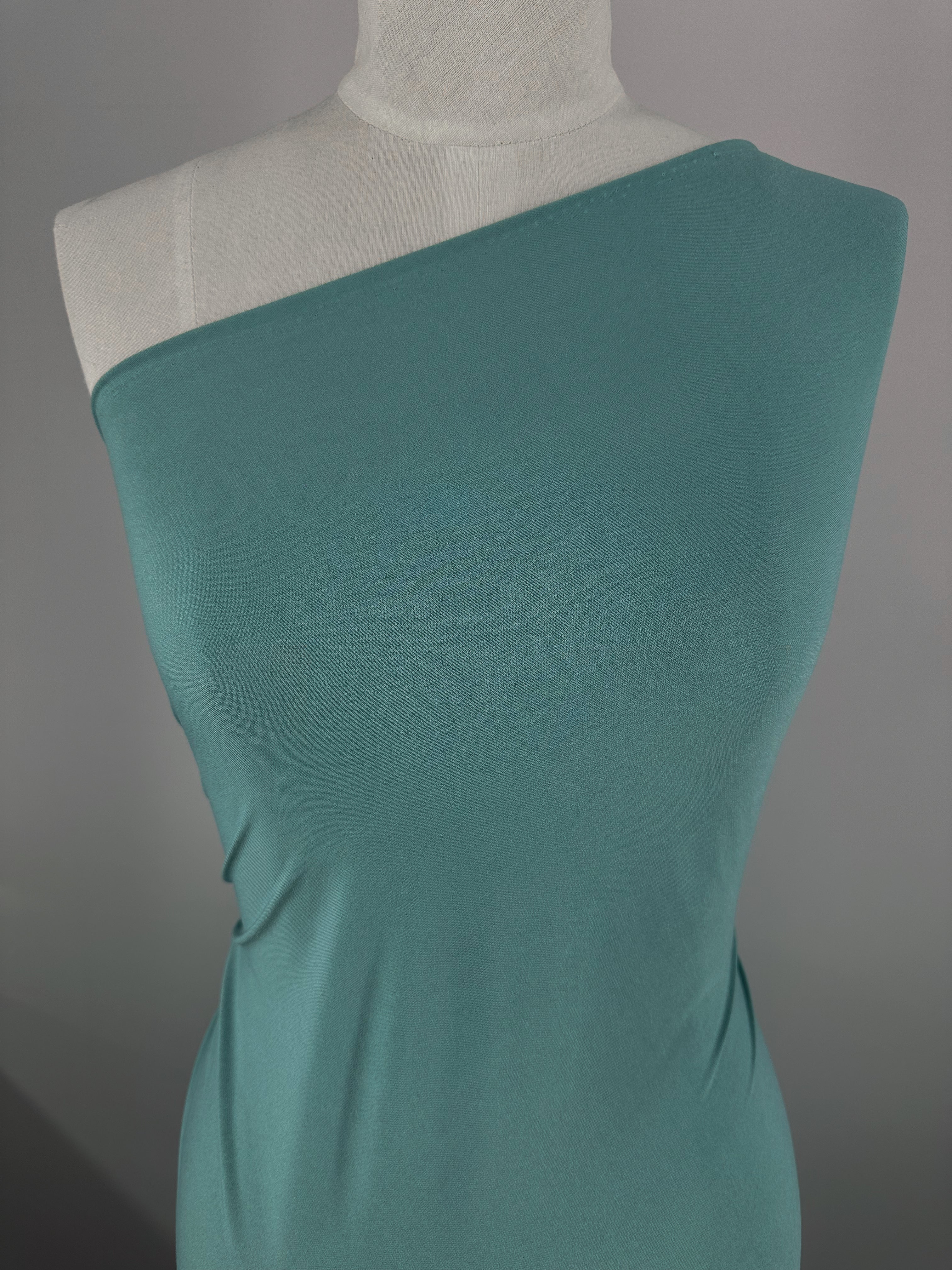 Super Cheap Fabrics’ ITY Knit - Arctic - 150cm is a light teal, medium-weight fabric with a smooth texture, soft drape, gentle sheen under light, and subtle stretch for comfort—perfect for projects needing elegant spirals and folds.