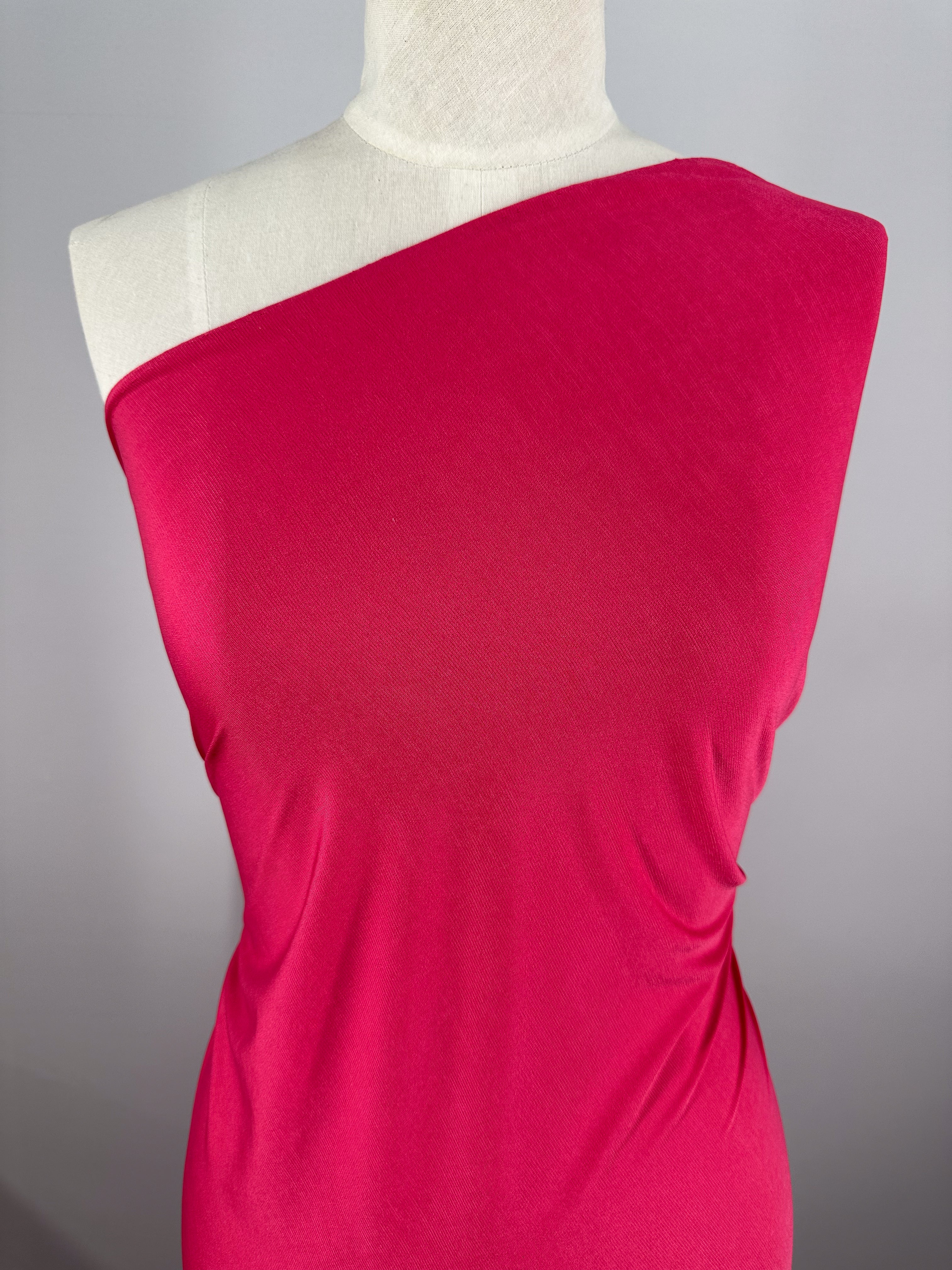 Interlock twist yarn fabric. This opaque fabric has been knit to have great elasticity and a soft touch. This medium weight fabric is the perfect weight for tops, dresses skirts and loose pants.