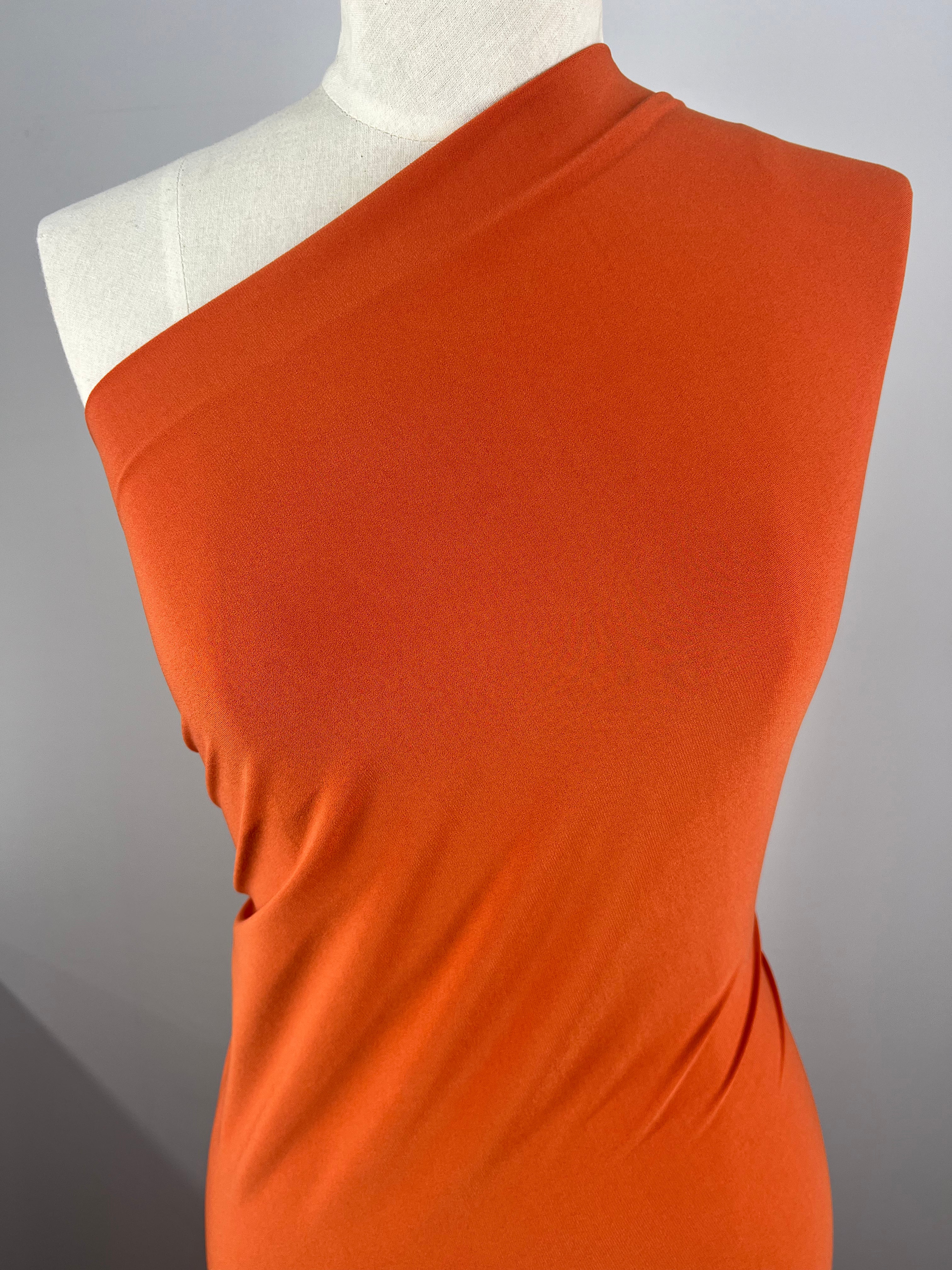 A mannequin is draped in a vibrant Super Cheap Fabrics ITY Knit - Burnt Orange - 150cm fabric. The polyester-spandex blend has a smooth texture and is wrapped tightly around the torso, highlighting the contours of the mannequin. The background is plain and gray, allowing the fabric's color to stand out.