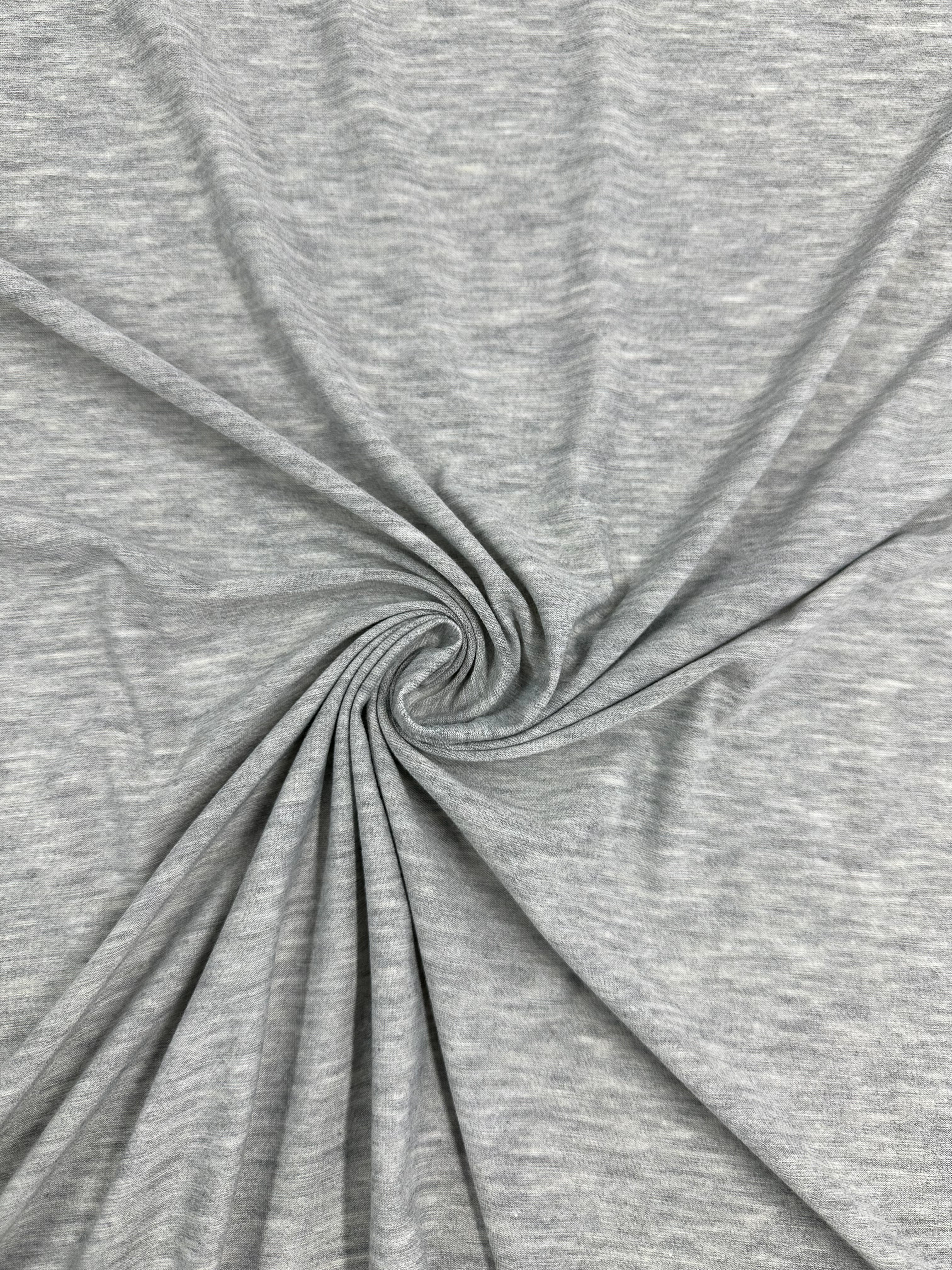 A close-up view of a large roll of lightweight jersey fabric. The Jersey - Grey - 170cm from Super Cheap Fabrics has a subtle textured pattern, with slight variations in shading and weave. The roll is partially unrolled, revealing a smooth surface. The overall appearance is clean and uniform.