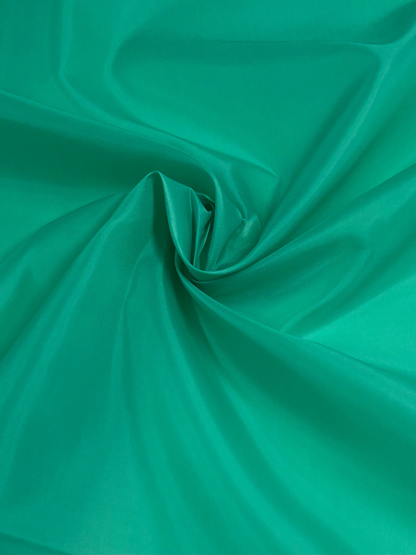A close-up of a smooth, Aqua Green polyester lining with a swirl pattern in the center. The lightweight fabric appears glossy and flows gently from the center swirl, creating soft folds and creases. The vibrant shade of green is evenly distributed across the material. This is the Lining - Aqua Green - 150cm by Super Cheap Fabrics.