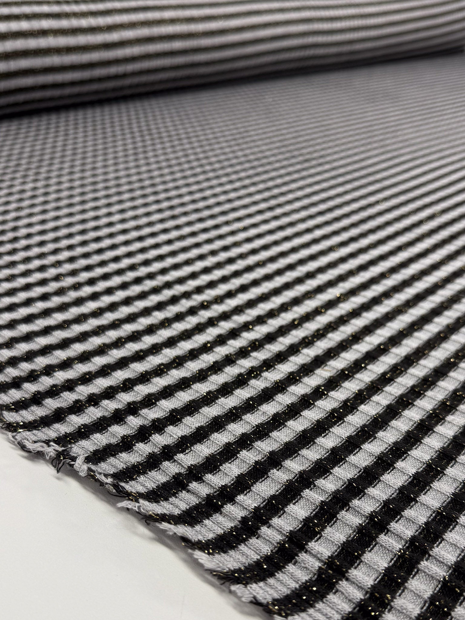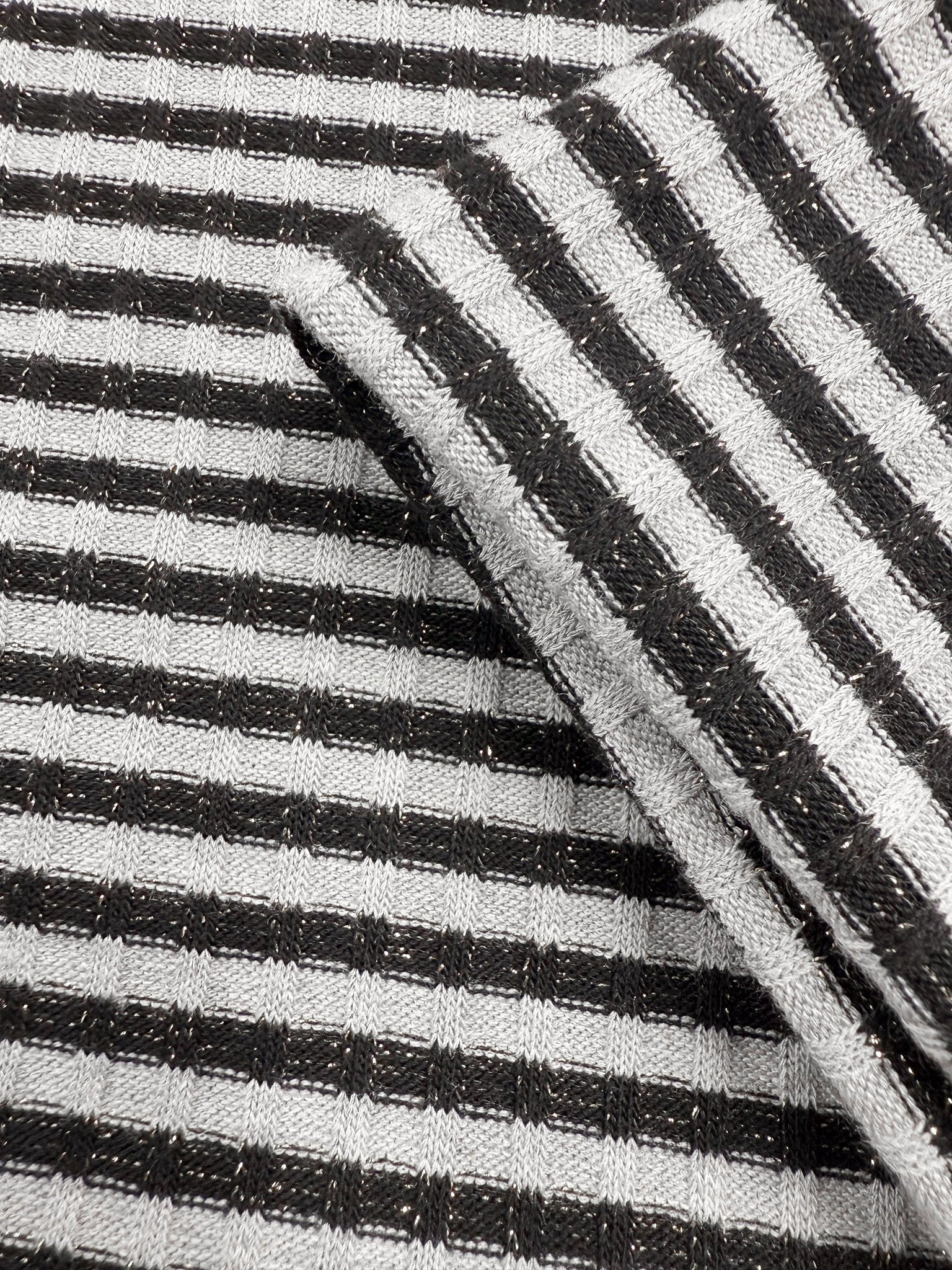 A black and white striped lurex knit fabric with fine metallic (lurex) threading.