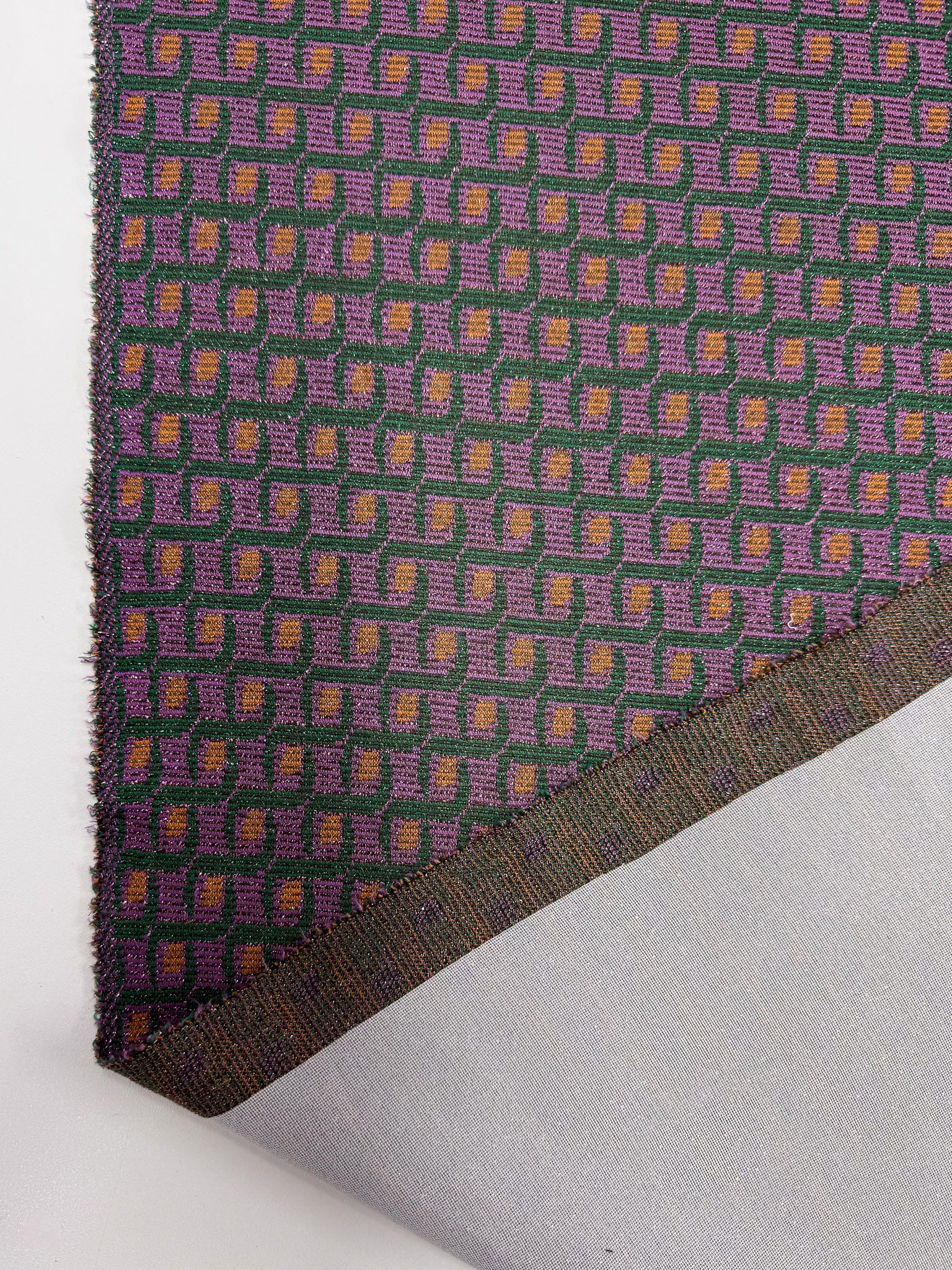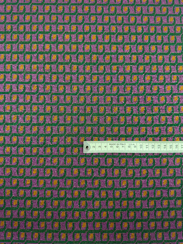 A lurex knit fabric with a geometric pattern in purple, green, and gold with a luxe woven texture.