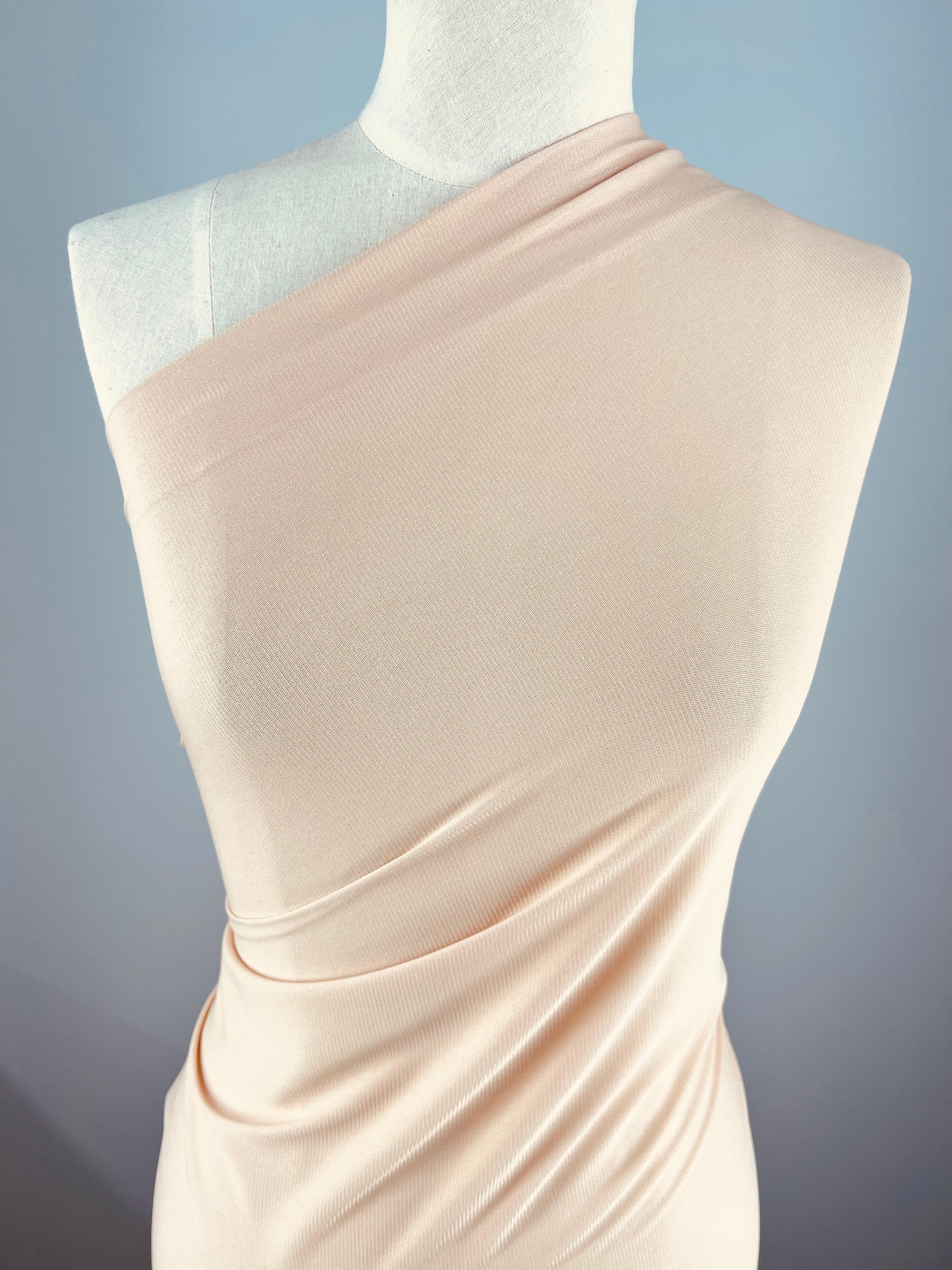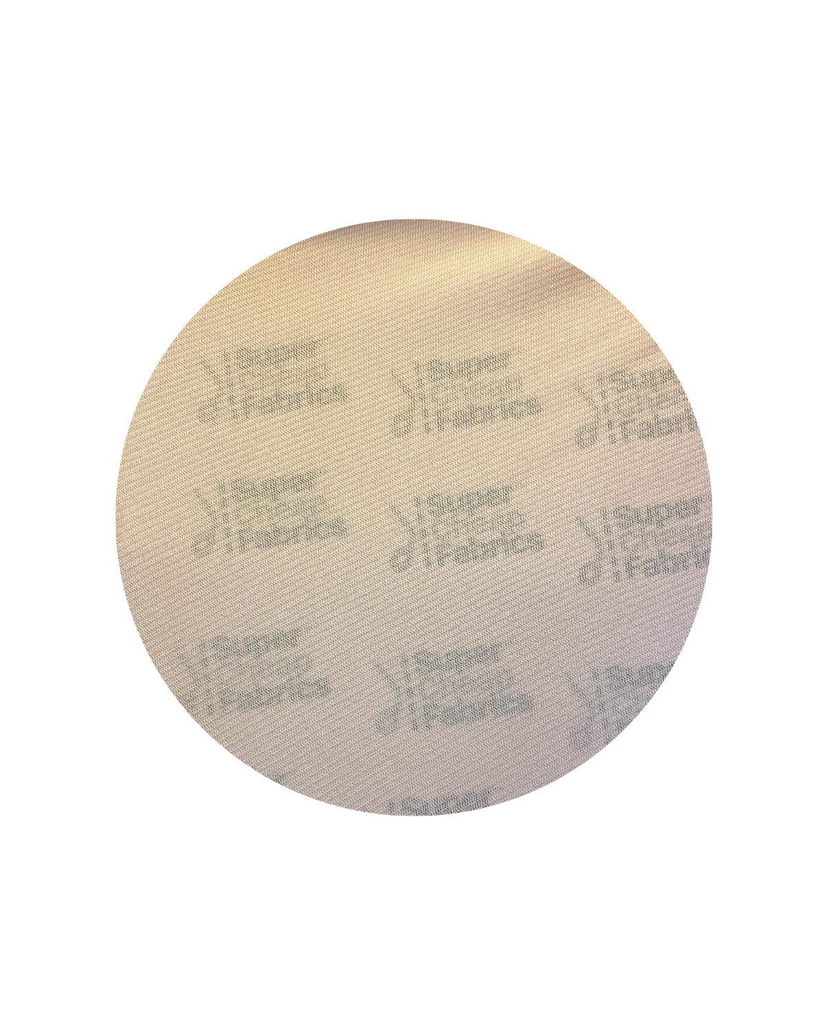 A circular swatch of Shell Blush plain mesh fabric from Super Cheap Fabrics, 120 GSM, semi-sheer light beige polyester with a subtle woven texture, faint gray branding and logo on a white background. Width: 162cm.