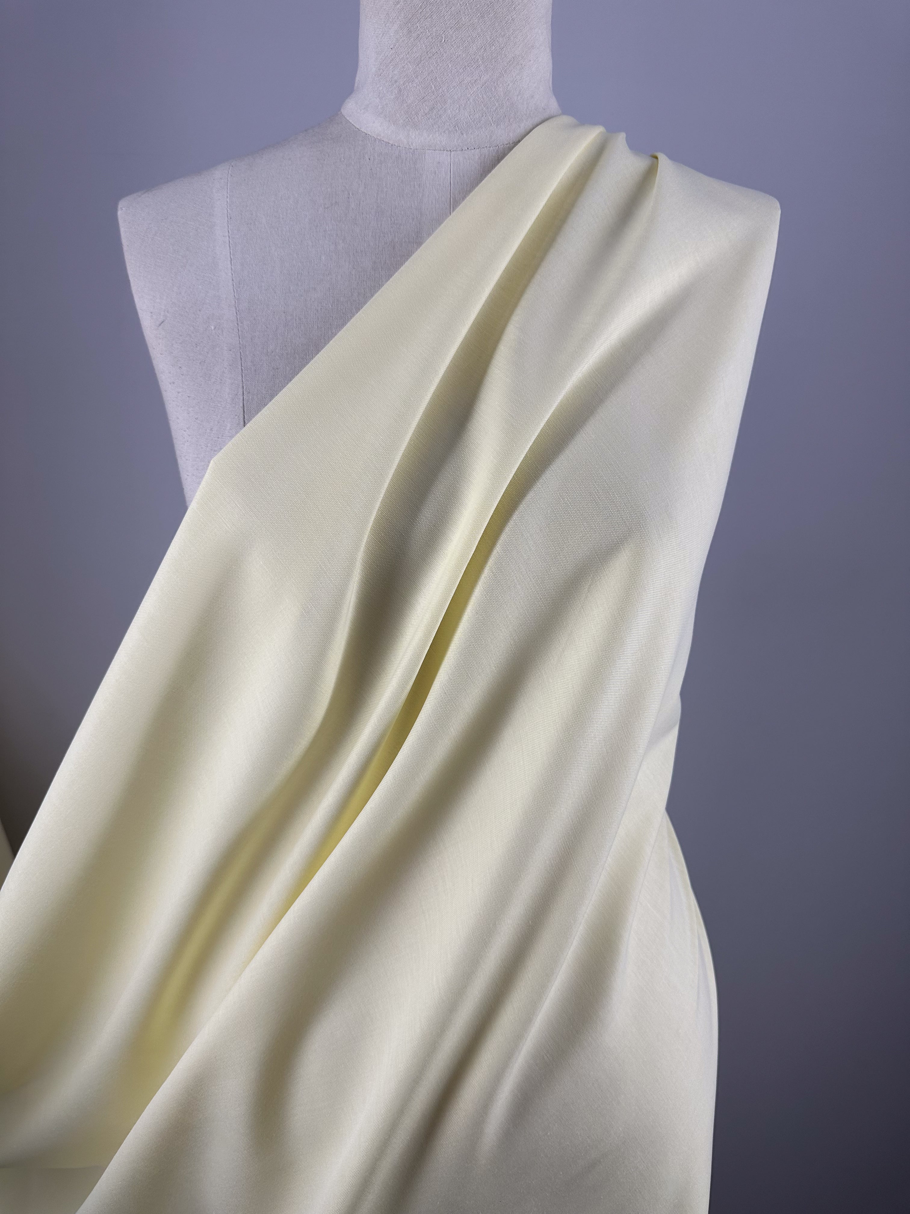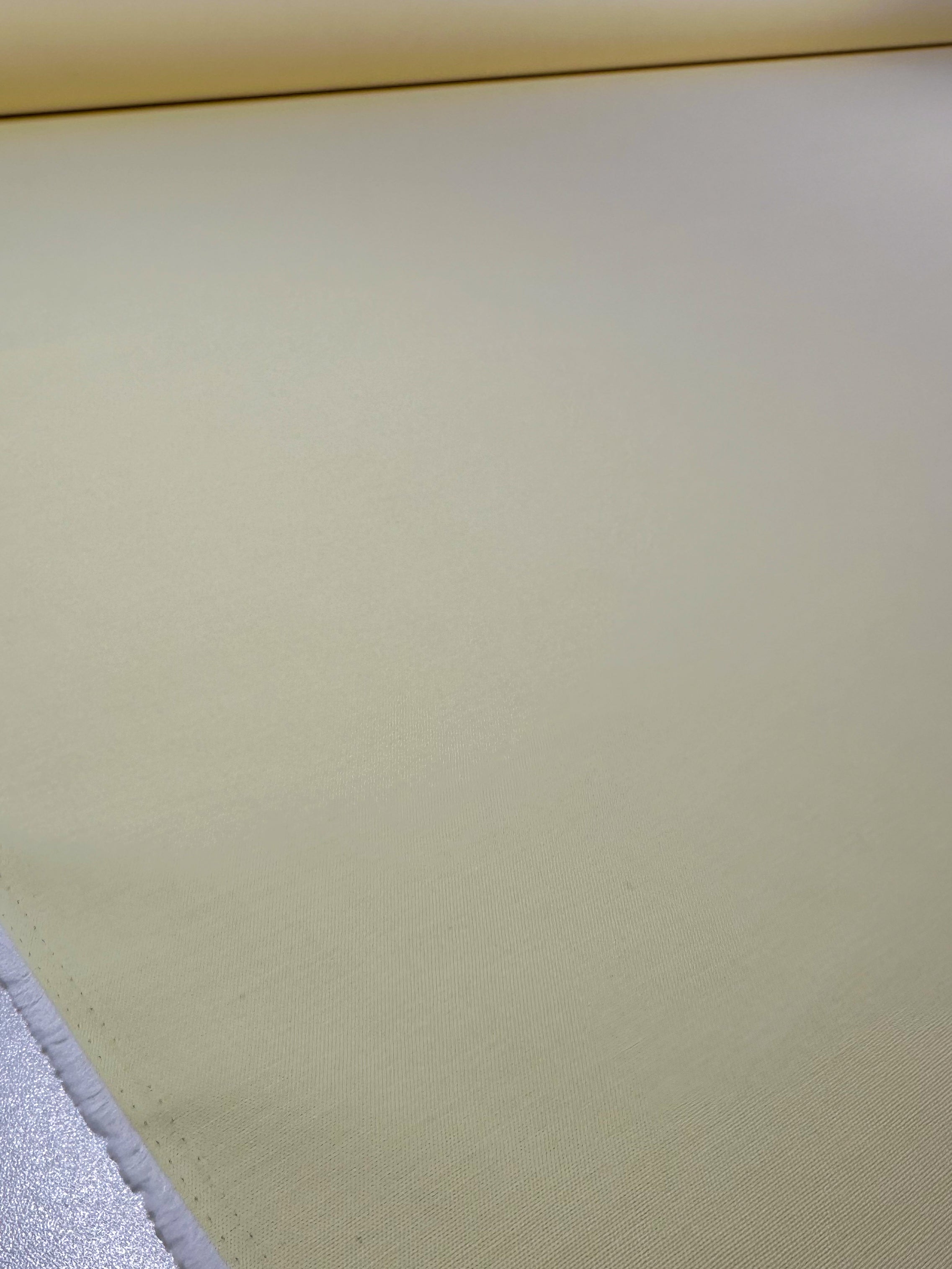 A close-up of Super Cheap Fabrics' Oxford Cotton - Lemon (146cm) shows its pale yellow hue and subtle texture, loosely gathered into a swirl to display both the smooth surface and unfinished white edge.