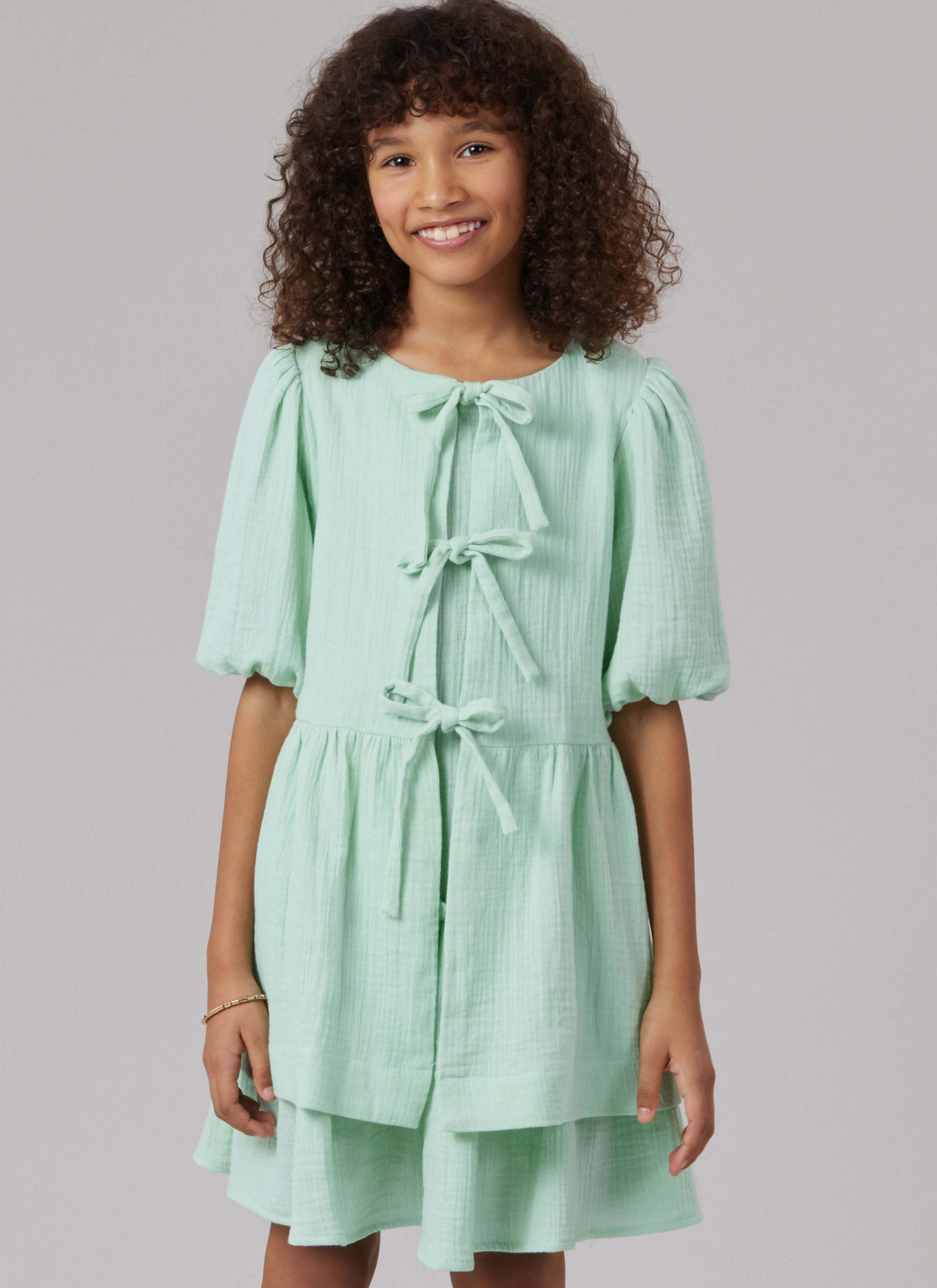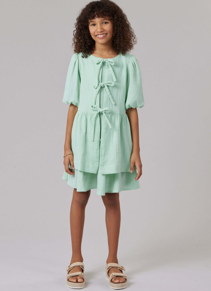 The coordinating round-neck top is just as delightful, featuring front tie details and soft gathers at the waist and sleeves for a relaxed, playful look. Perfect for both everyday wear and special occasions, these pieces are as fun to make as they are to wear.