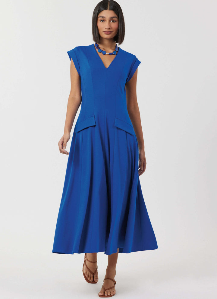 This flattering fit-and-flare dress combines timeless style with practical details, making it a versatile addition to any wardrobe. The design features a classic V-neckline that enhances the neckline and adds a touch of elegance, along with convenient side seam pockets, perfect for storing small essentials without disrupting the silhouette. A center-back zipper closure ensures a secure and smooth fit.