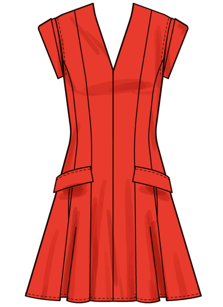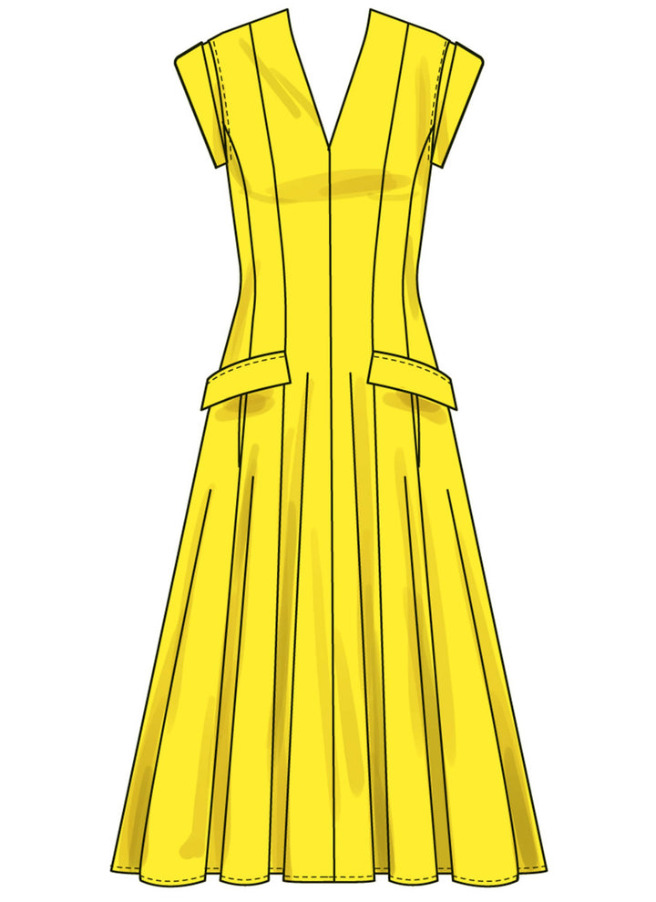 Views A and B include short fold-back sleeves that add a soft, tailored feel, while a unique angled flap detail is applied to the top of each pocket, giving the dress a stylish, modern twist. View C offers a sleeveless variation, ideal for warmer days or layering under jackets and cardigans. Whether dressed up or down, this dress is designed to offer both comfort and style for everyday wear or special occasions.