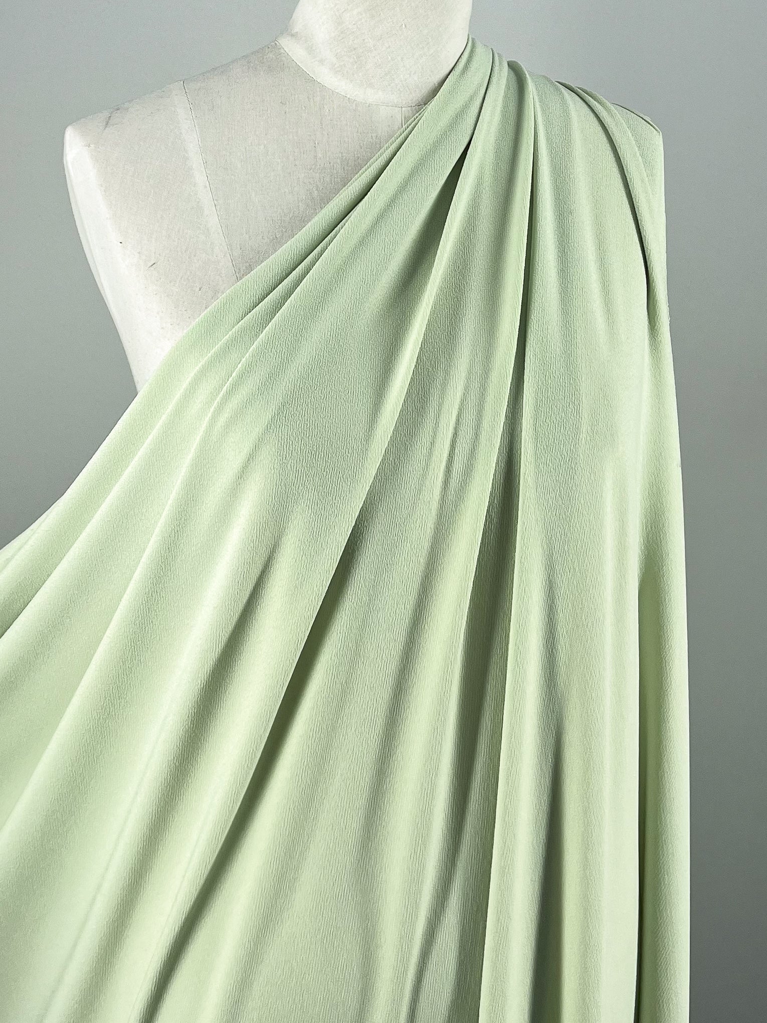 The pistachio Crepe Lycra fabric from Super Cheap Fabrics elegantly cascades over a mannequin on a gray background. At 148cm wide, this soft, medium-weight fabric flows smoothly across the form.