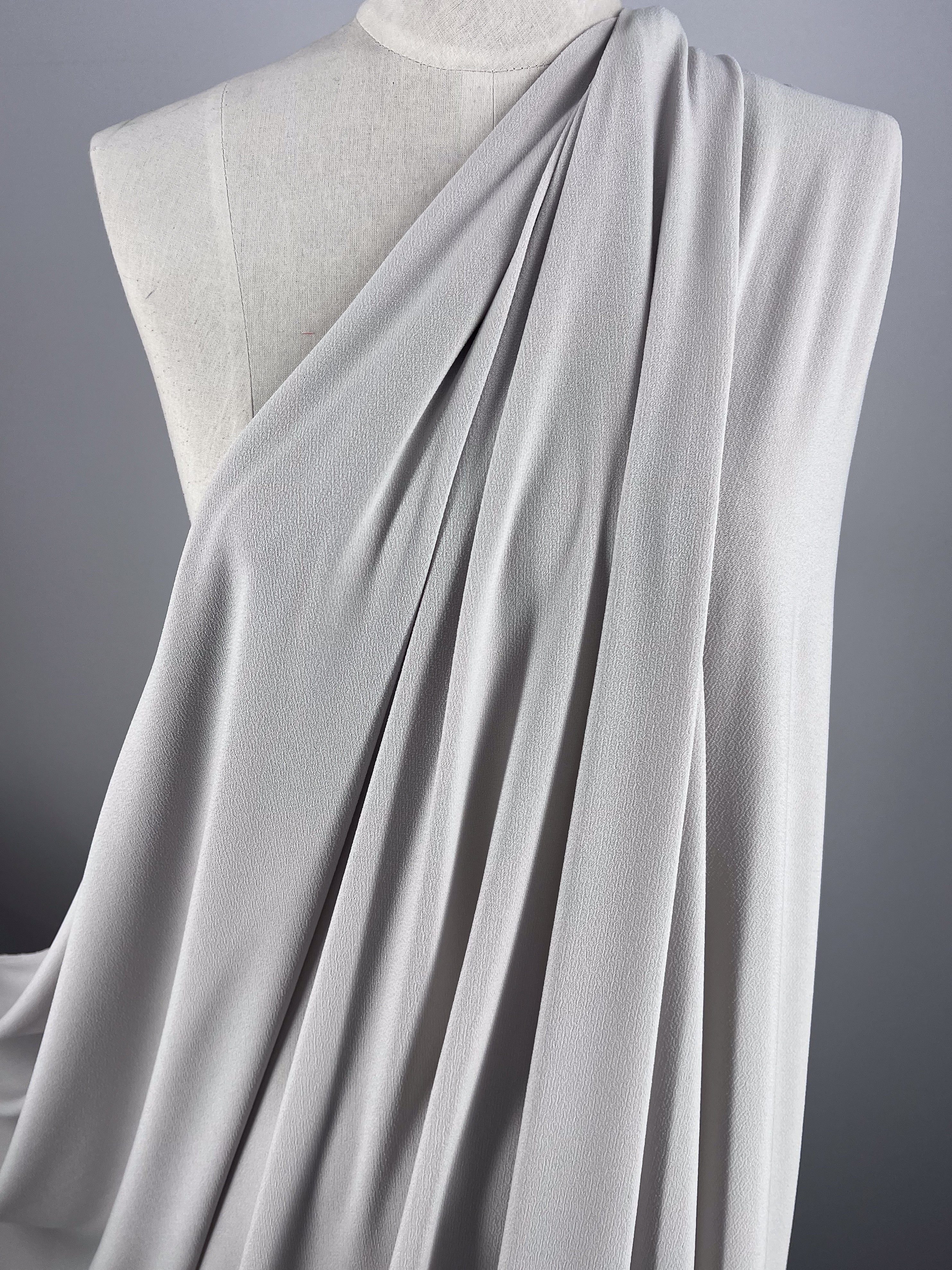 A close-up of a draped piece of Crepe Lycra - Silver - 148cm by Super Cheap Fabrics on a mannequin. The medium-weight fabric is arranged in folds, showcasing its texture and fluidity against the backdrop of a plain, neutral wall.