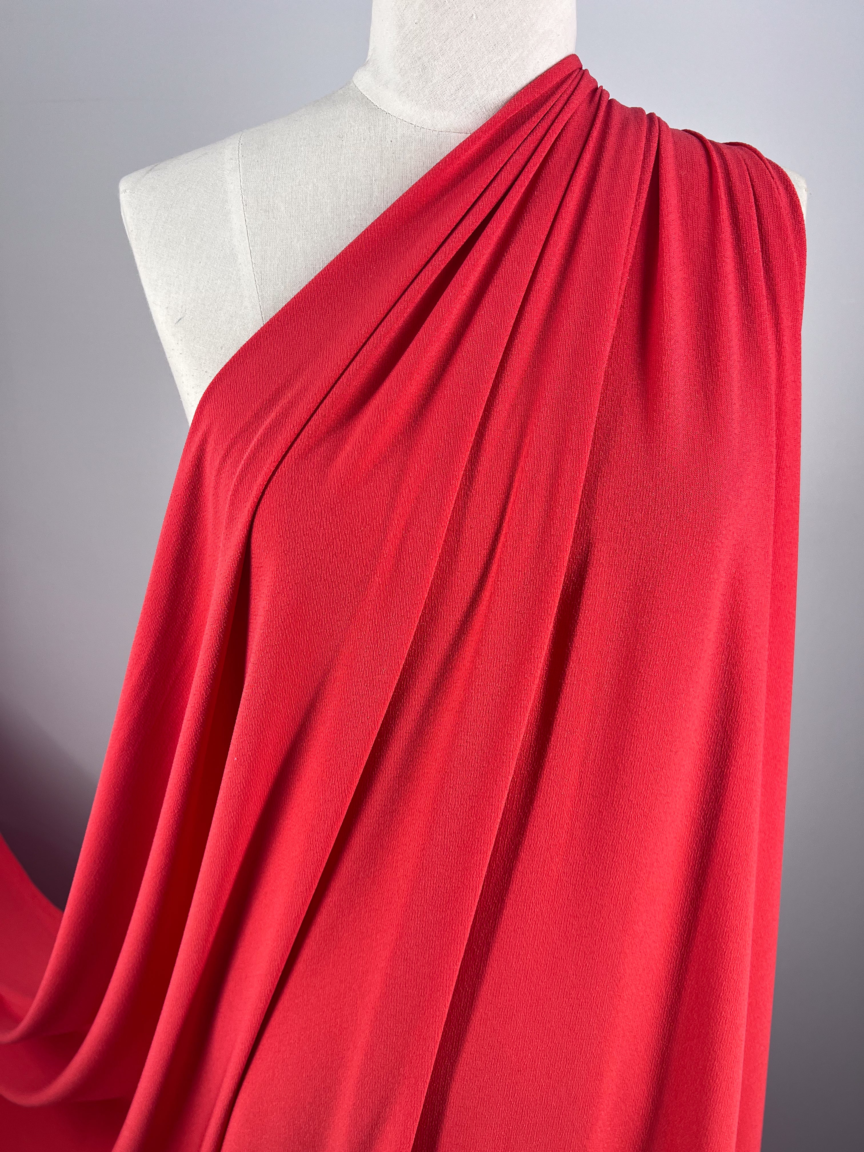 A mannequin draped in Super Cheap Fabrics' Crepe Lycra - Tangelo showcases vibrant coral pink fabric, gathered at the shoulder and elegantly cascading. The material's texture and pleats are highlighted against a neutral gray background.