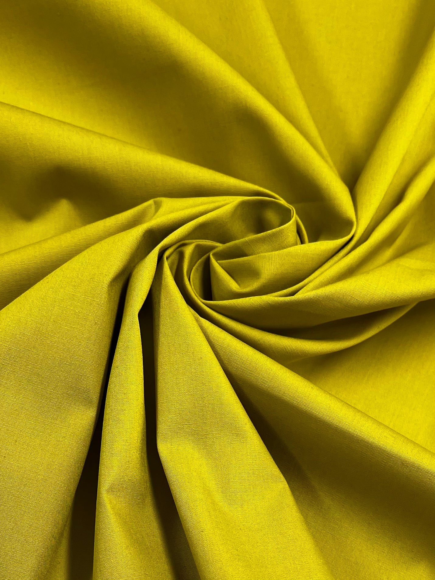 Close-up of Super Cheap Fabrics' Plain Cotton - Antique Moss (150cm), lightweight 100% cotton, gathered in a spiral to showcase its smooth texture, bright yellow hue, and elegant folds.