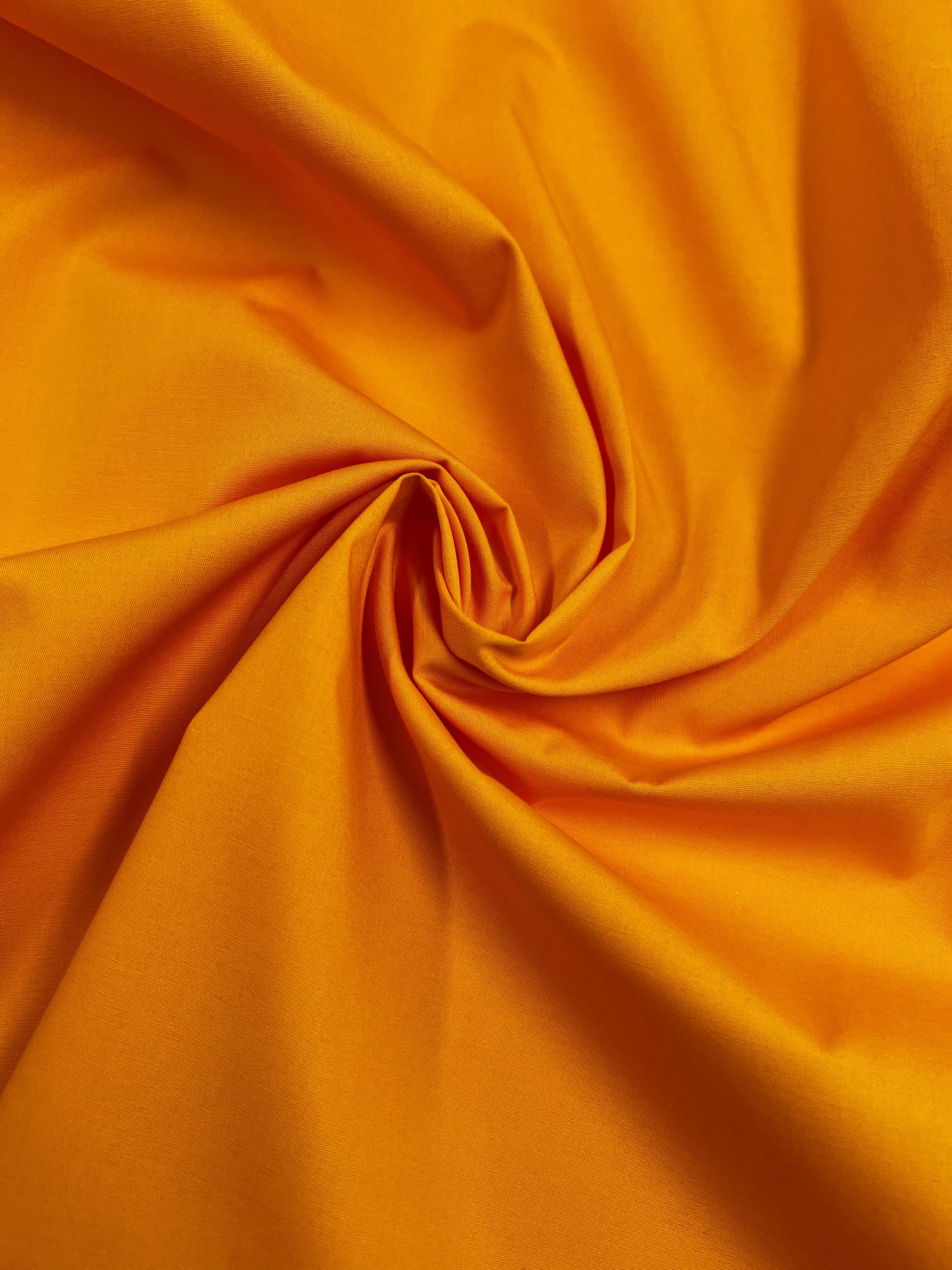 Super Cheap Fabrics' Plain Cotton - Zinnia - 147cm is a lightweight, 100% cotton fabric in a vibrant orange shade with a subtle sheen, arranged in soft spiral folds that showcase its smooth texture and vivid color.