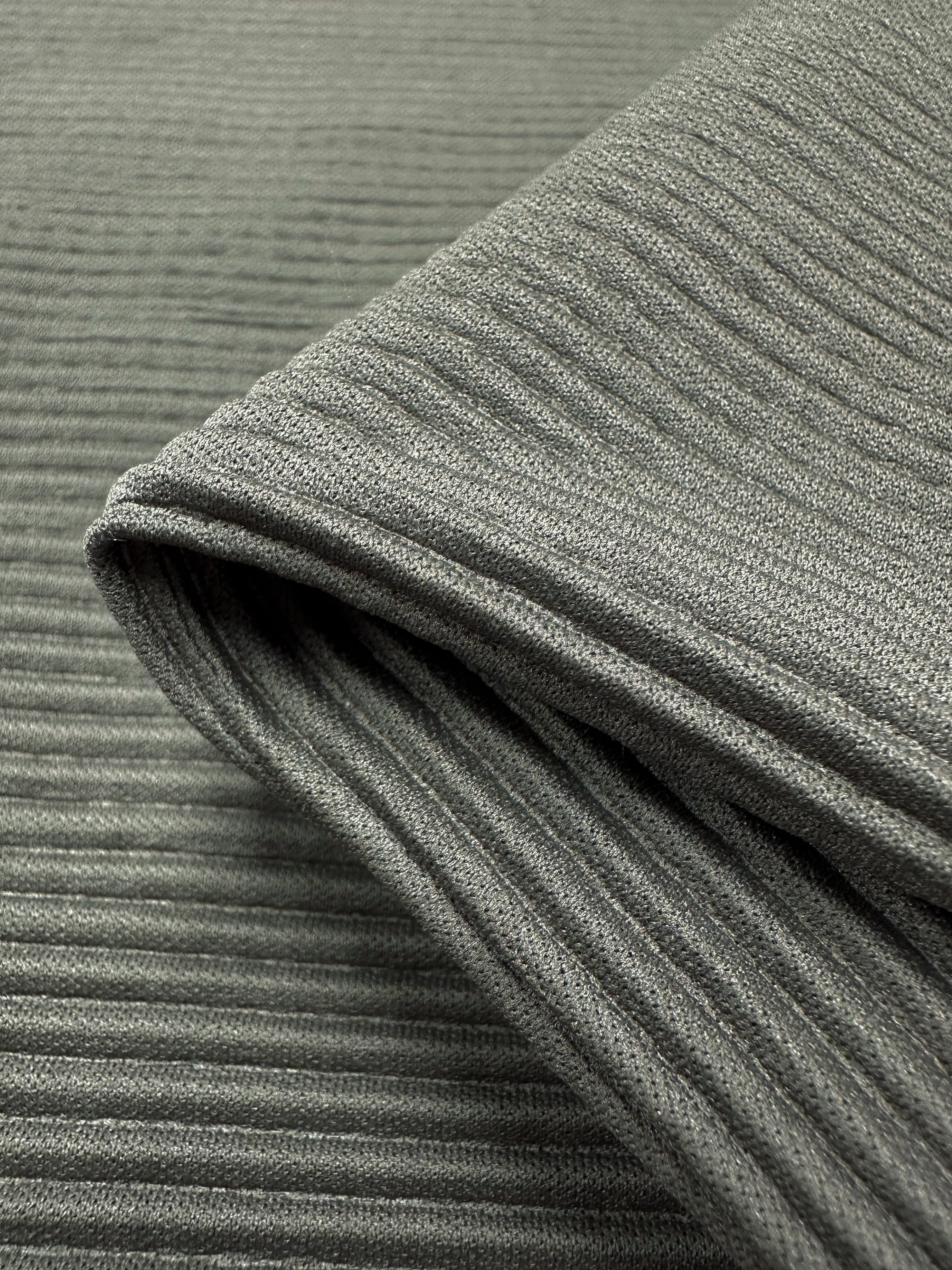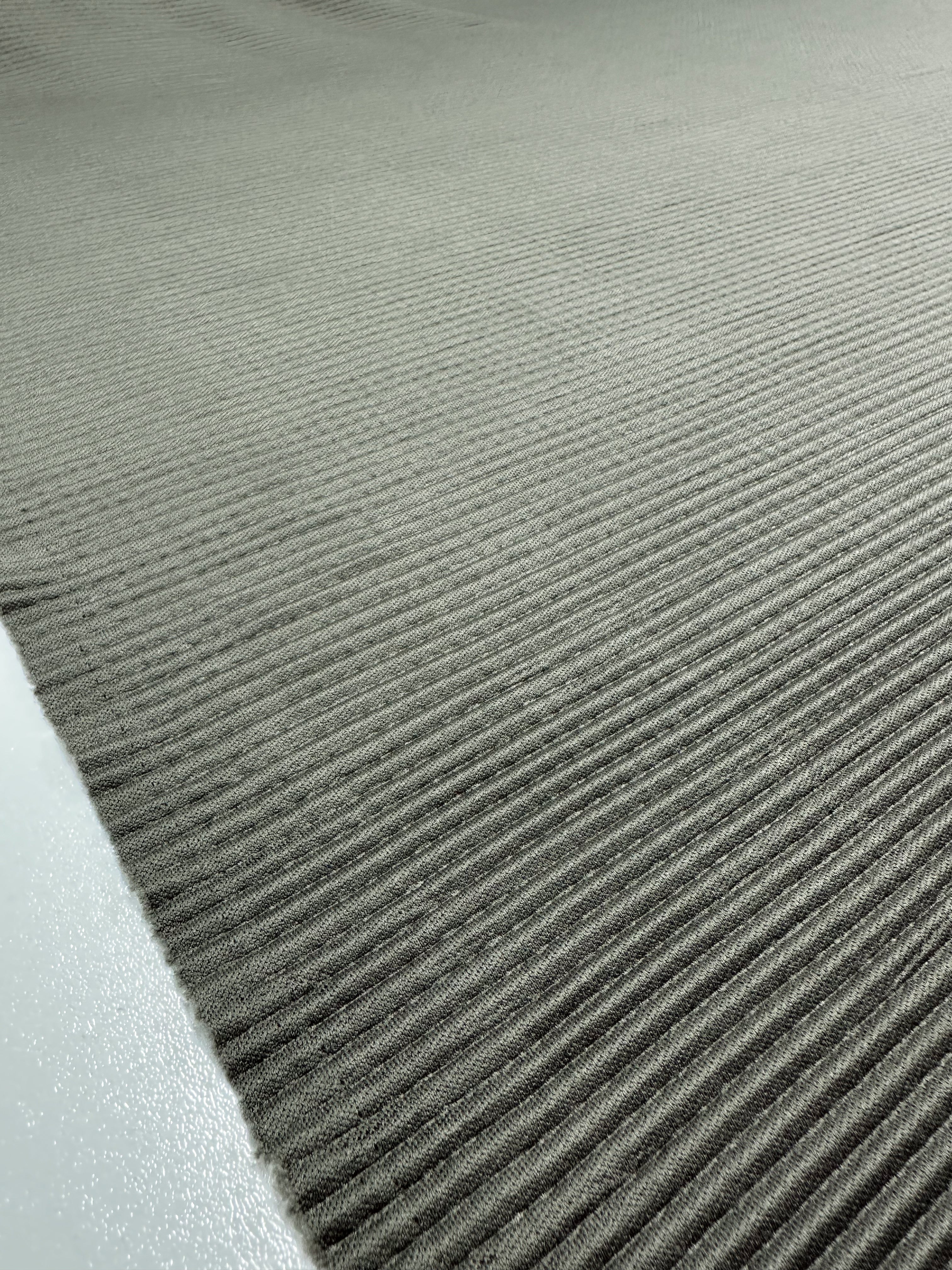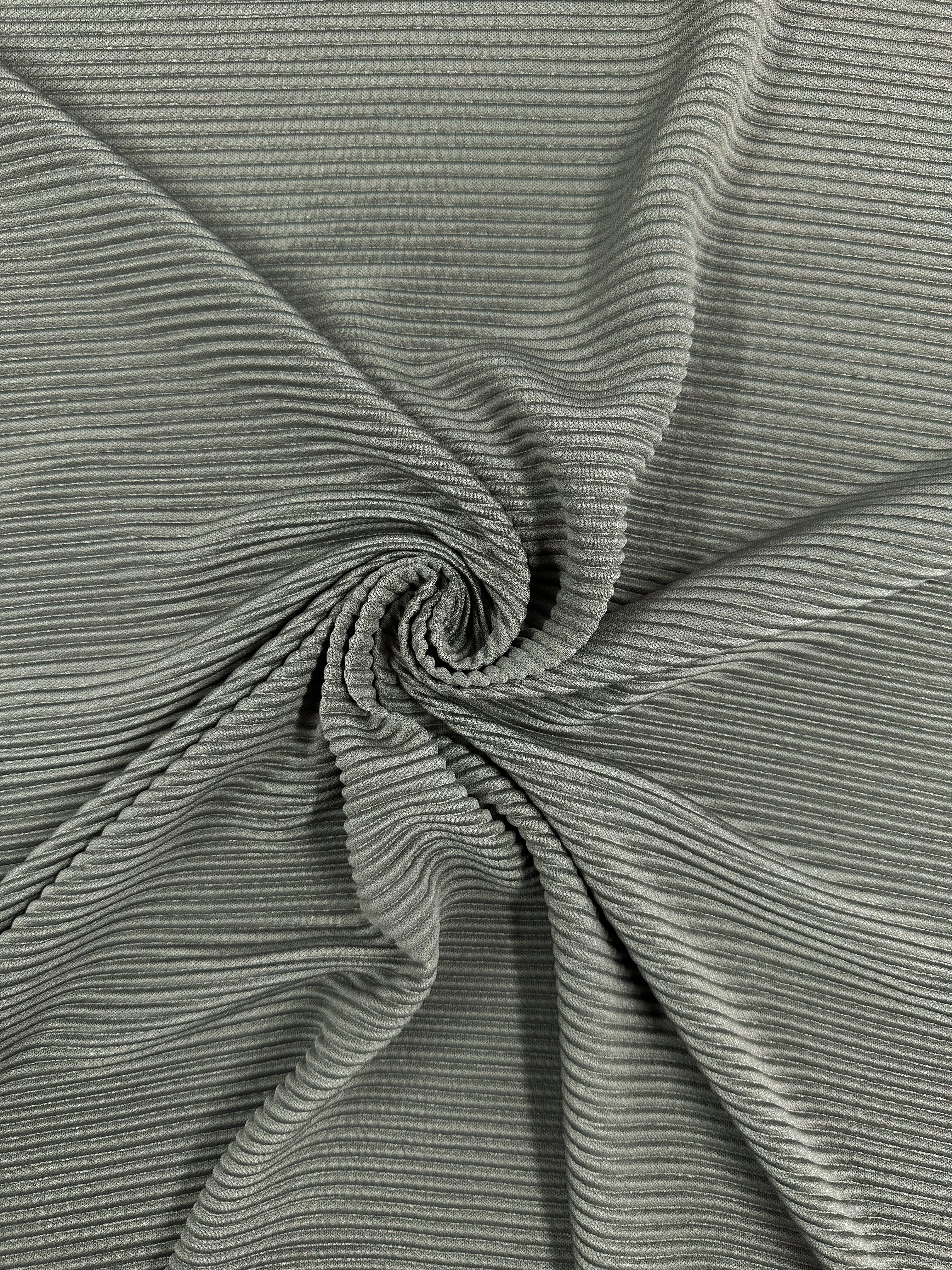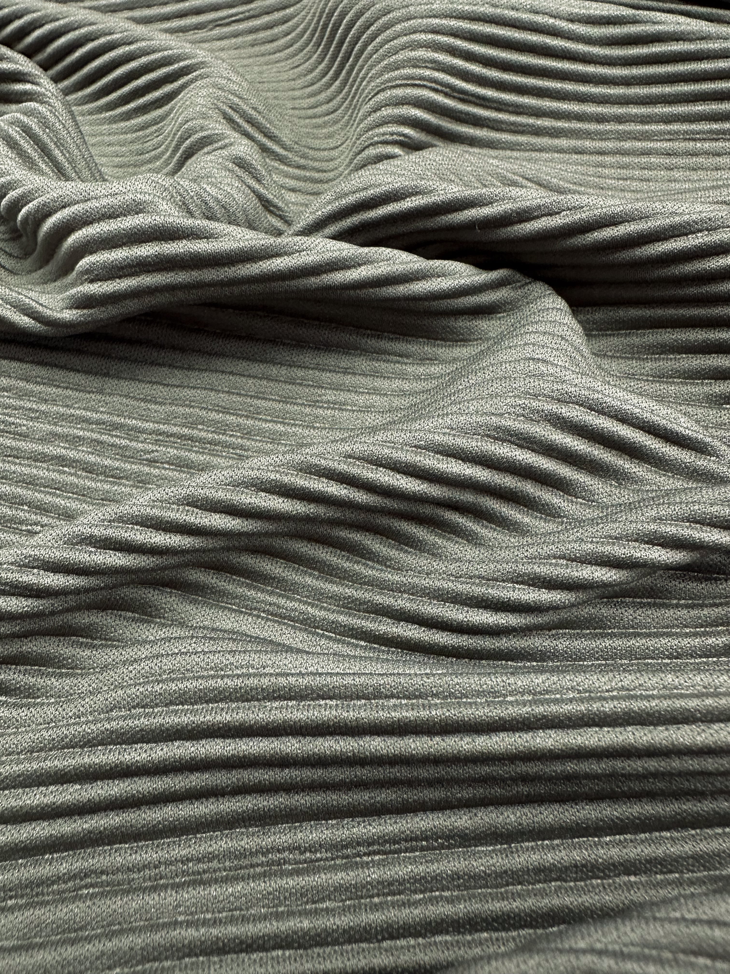 A close-up of Super Cheap Fabrics' Pleat - Pewter - 140cm showcases a lightweight, sage green polyester with fine horizontal ribbing. Draped in gentle folds, the fabric creates soft shadows and conveys a sense of movement.