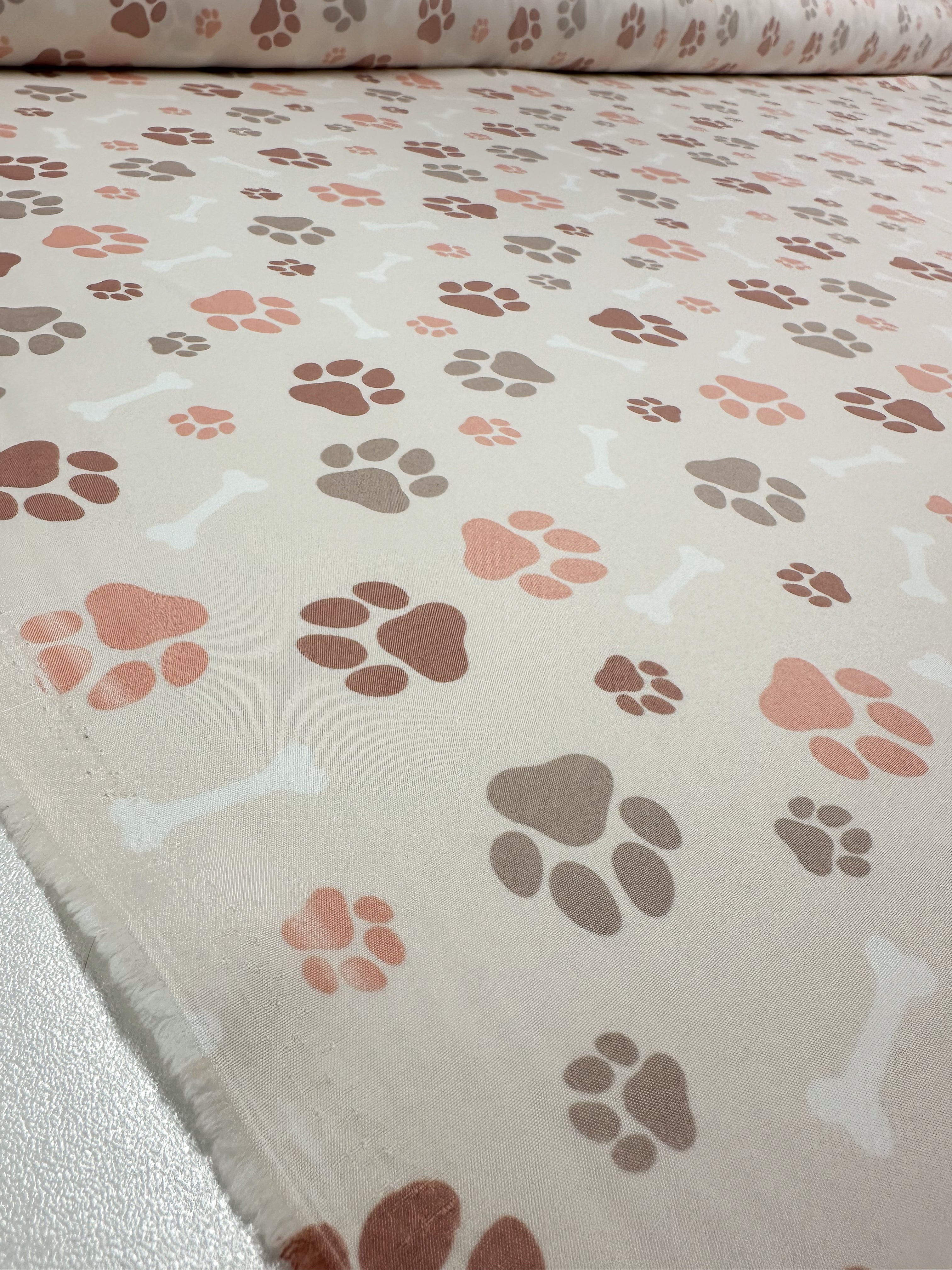 The Printed Delustered Satin - Pawsies by Super Cheap Fabrics features paw prints in brown, red, and peach with white dog bone shapes on a light beige background. Width: 155cm.