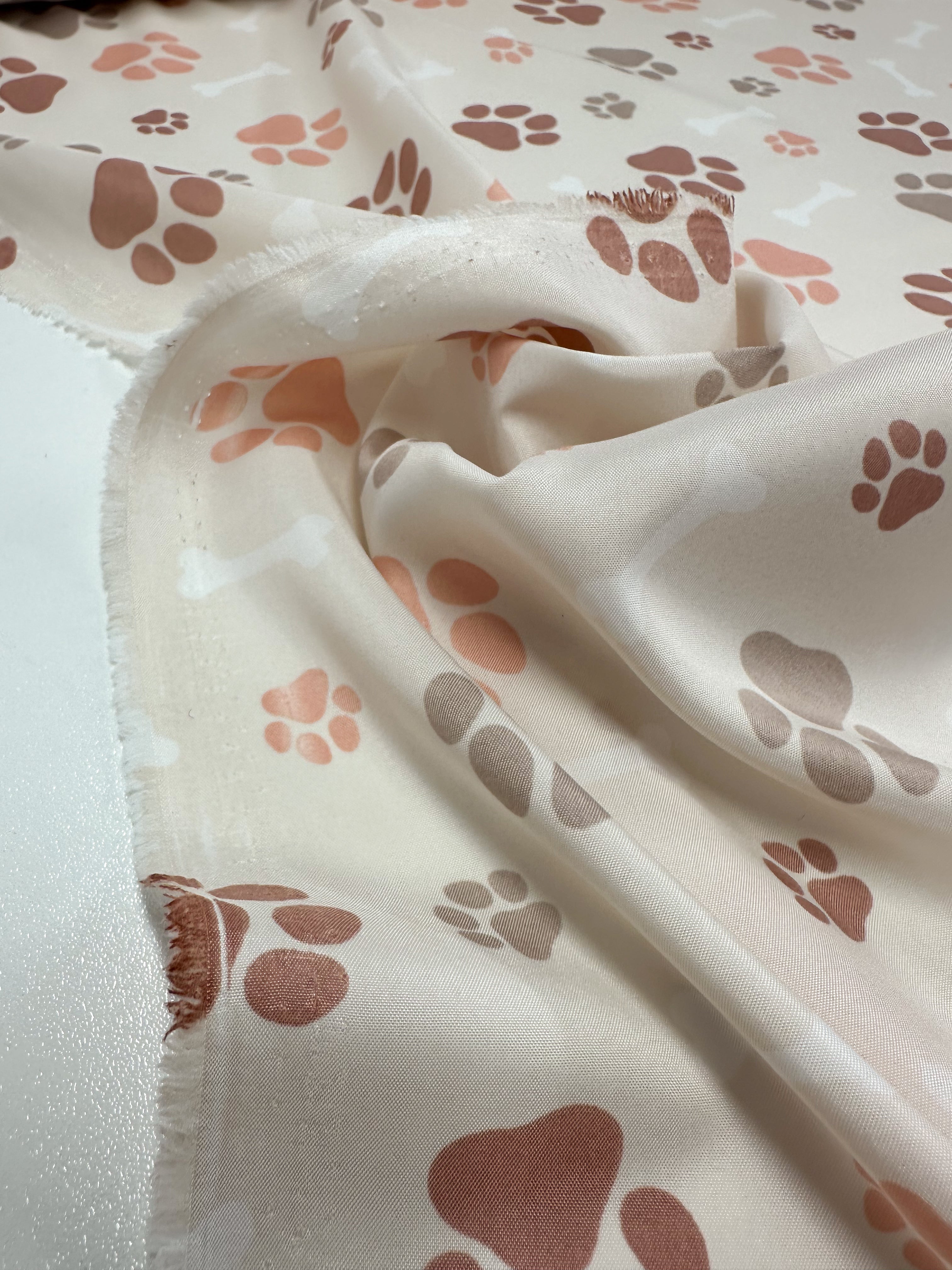 Close-up of Super Cheap Fabrics' Printed Delustered Satin - Pawsies, showcasing a whimsical pattern of brown, tan, and peach paw prints and dog bones on light beige. Slightly folded, it adds charm to these elegant 155cm pieces.